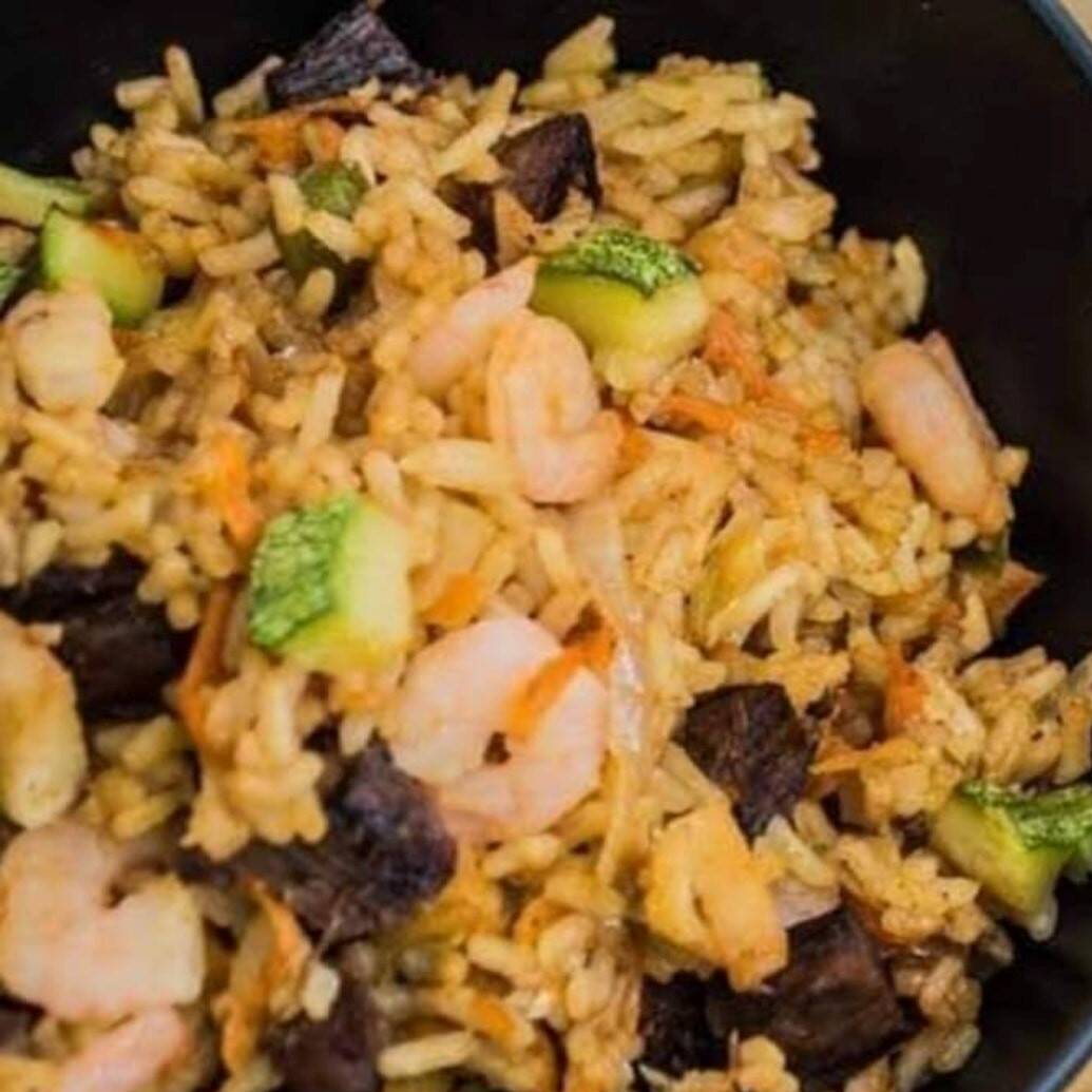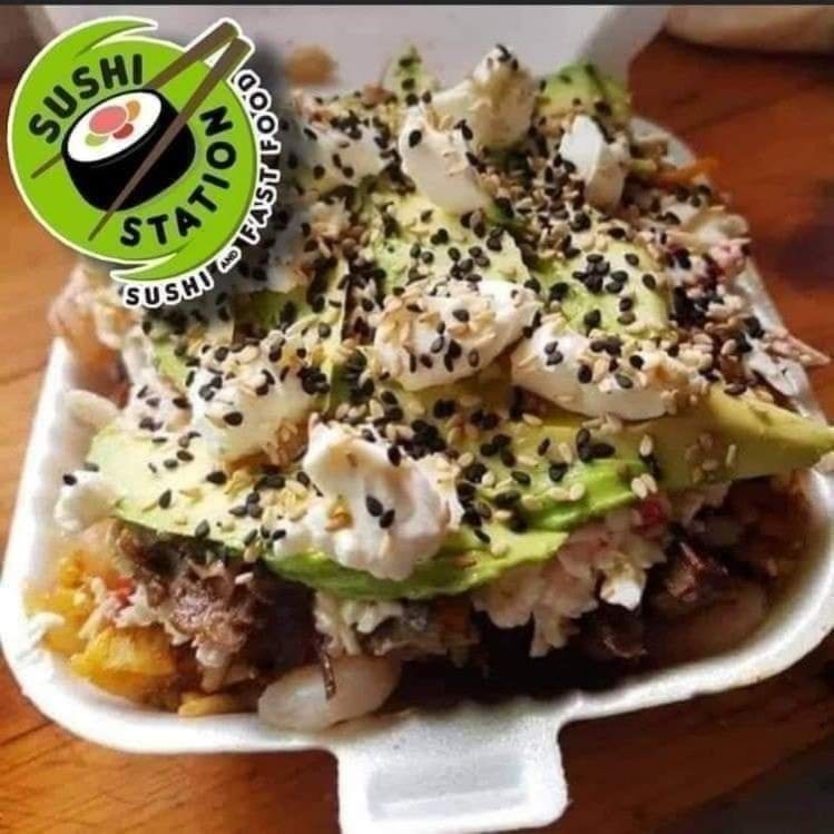 Base de arróz blanco con pollo, camarón, arrachera, Tampico aguacate queso crema y ajonjolí