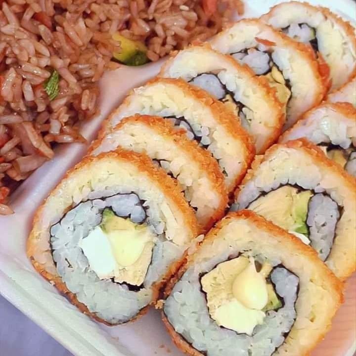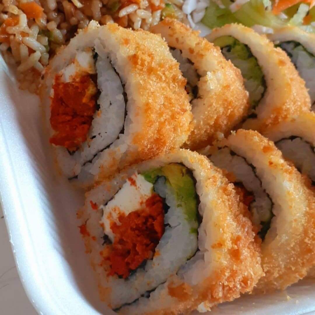 Empanizado tempura por fuera, por dentro, queso crema aguacate camarón y surimi