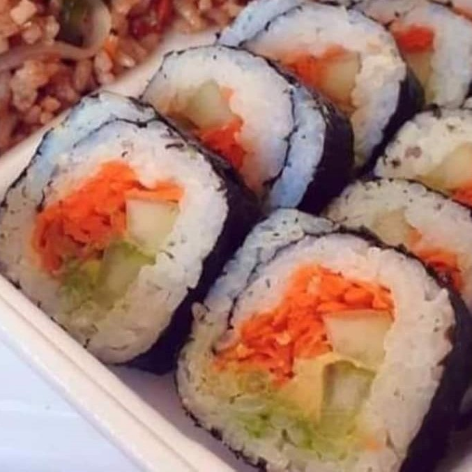 Enrollado en alga nori, por dentro pepino zanahoria, aguacate y queso crema
