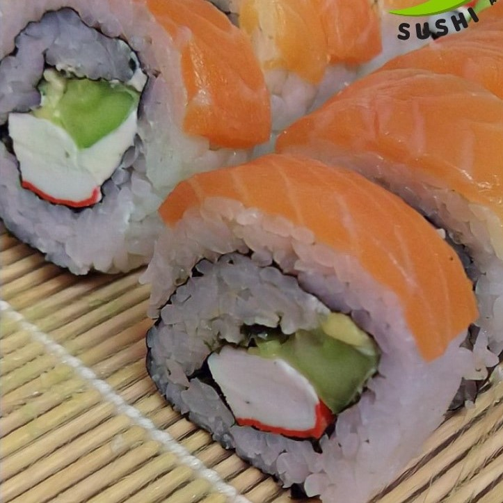 Arróz blanco por fuera, por dentro enrollado con alga nori, pepino, aguacate, queso crema y surimi