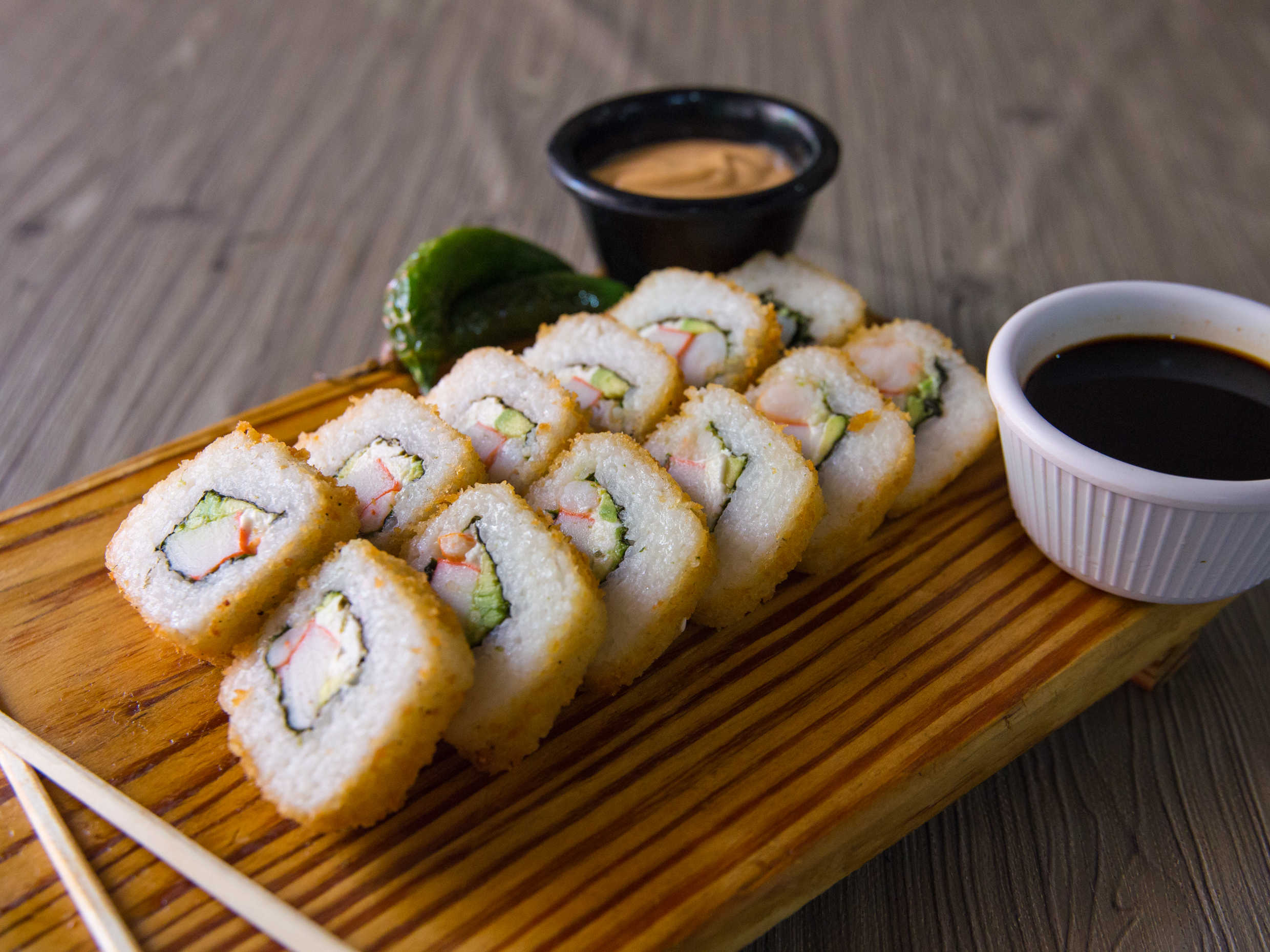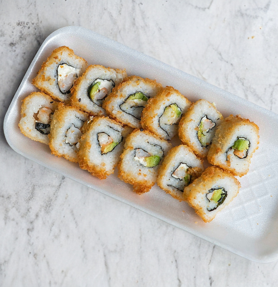 Relleno de camarón, surimi,aguacate,chipotle y philadelphia cubierto de pasta tampico (puedes pedirlo empanizado)
