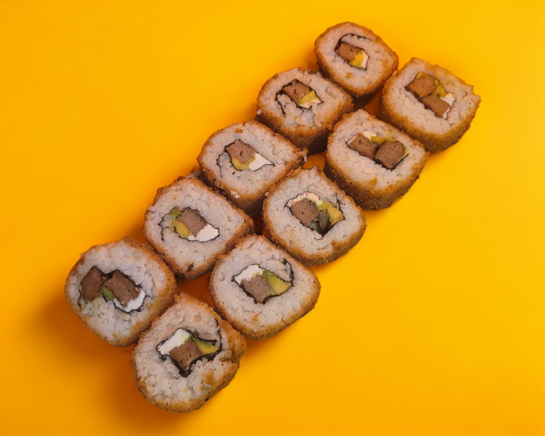 Rollo relleno de queso crema, aguacate y atun rojo fresco.
