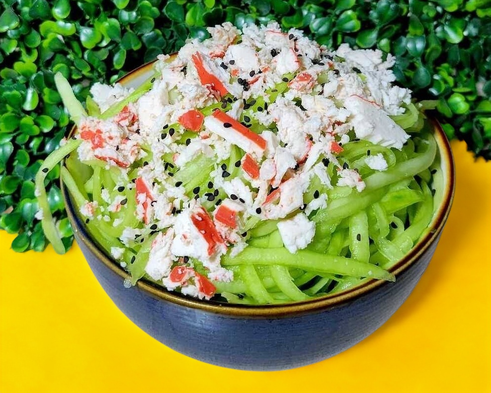 Pepino rayado, mezclado con surimi, ajonjoli y vinagre.