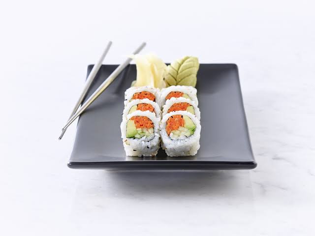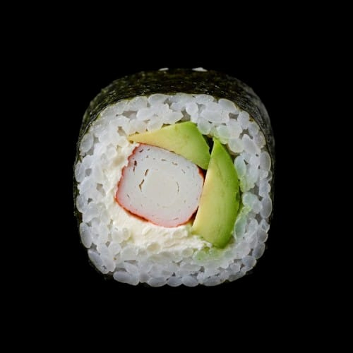 Exquisito rollo de surimi con cremoso queso philadelphia, aguacate y alga marina coronado con ajonjolí