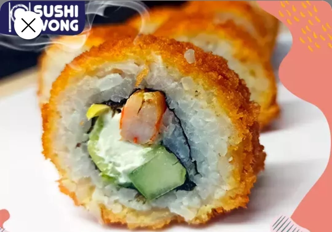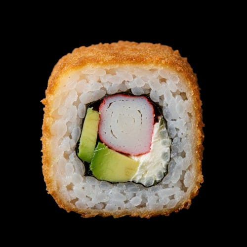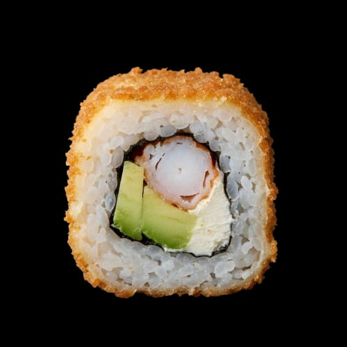 Exquisito rollo de camarón con cremoso queso philadelphia, aguacate y empanizado con panko