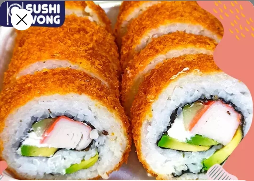 Deliciosa bola de arroz empanizada, con surimi rebanado, queso crema philadelphia, aguacate, pepino y ajonjolí
