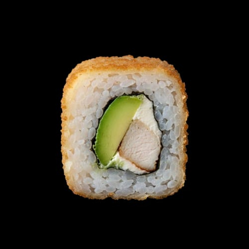 Exquisito rollo de pollo con cremoso queso philadelphia, aguacate, alga marina y empanizado con panko