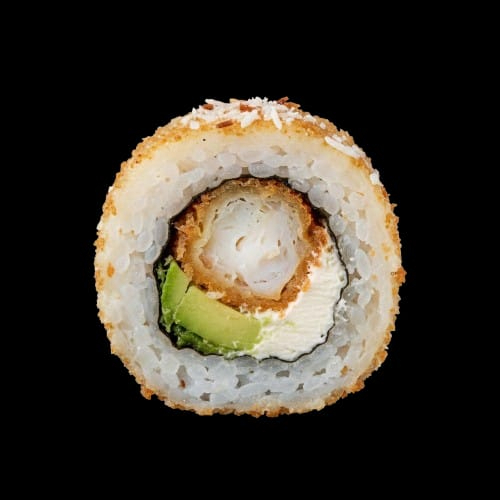 Rollo empanizado relleno de camarón empanizado con coco, aguacate y queso crema, coronado con un ligero toque de coco tostado por encima que realza su aroma y textura sin hacerlo dulce.