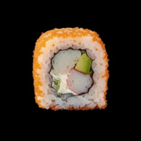 Surimi y aguacate con queso crema, cubierto con masago fresco que añade textura y un sutil sabor marino. Elegante y lleno de color.