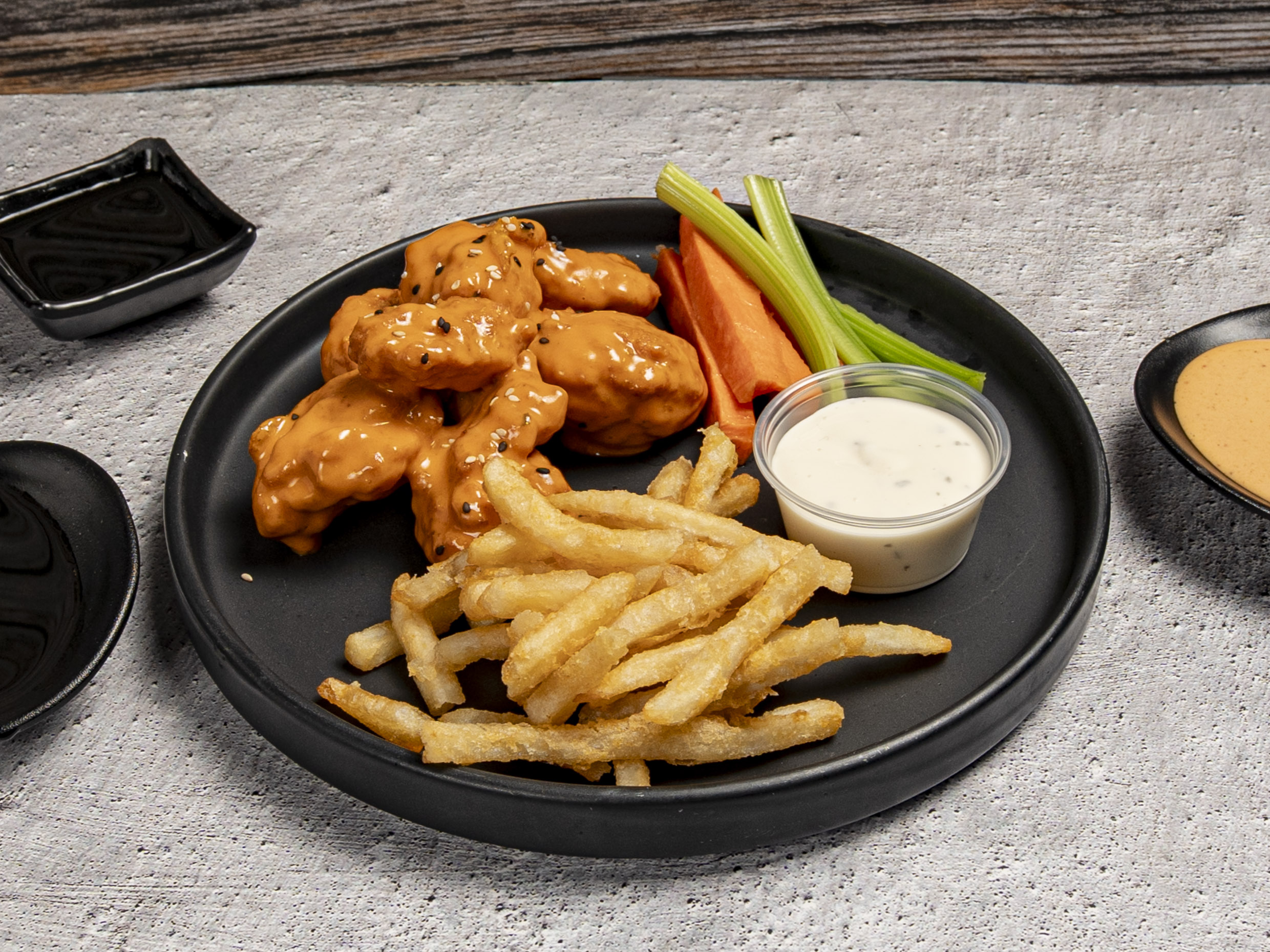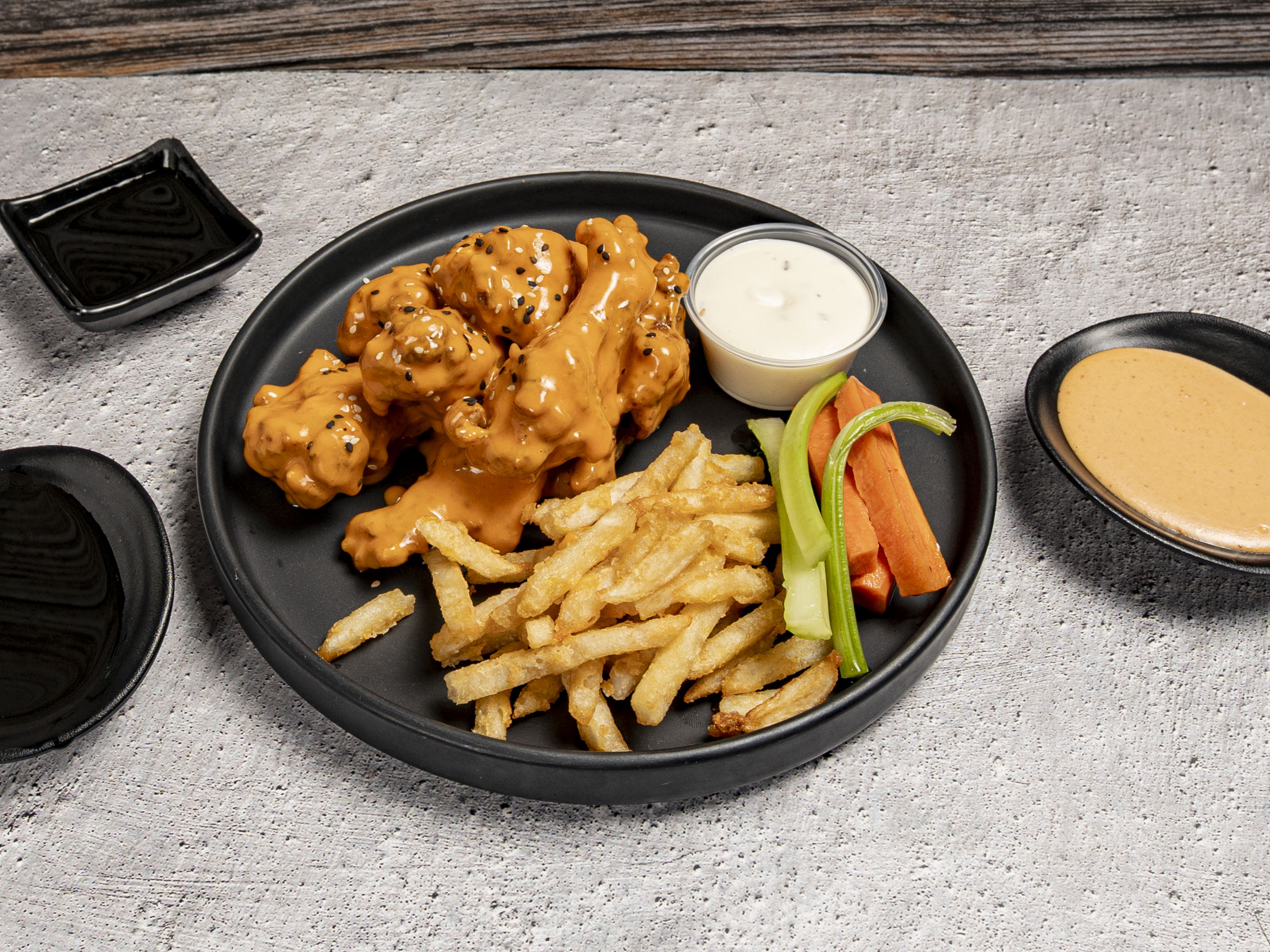 350g de alitas (6-7 pz), acompañadas de papas a la francesa, zanahoria,apio y aderezo ranch.