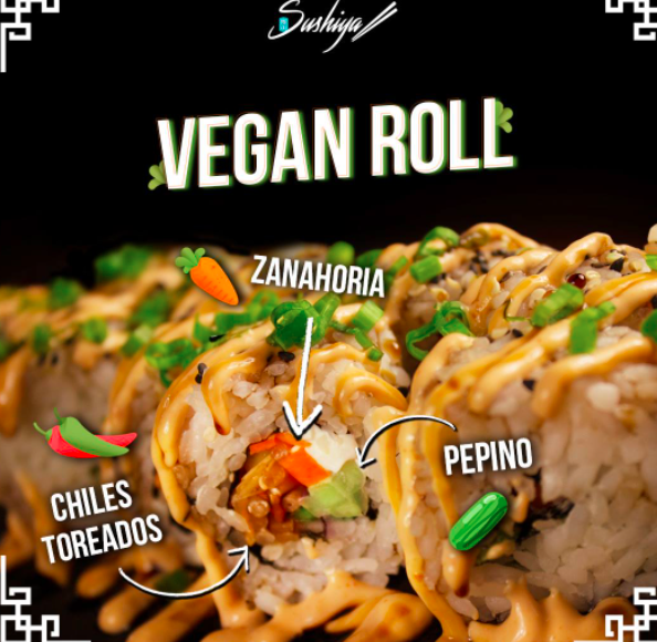 Pepino, zanahoria, tocino, vinagreta sushiya, surimi, furikake, acompañada de aderezo spicy, aderezo ajonjolí, salsa de anguila y frituras de tortillas mixtas.