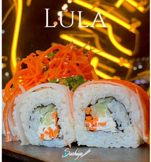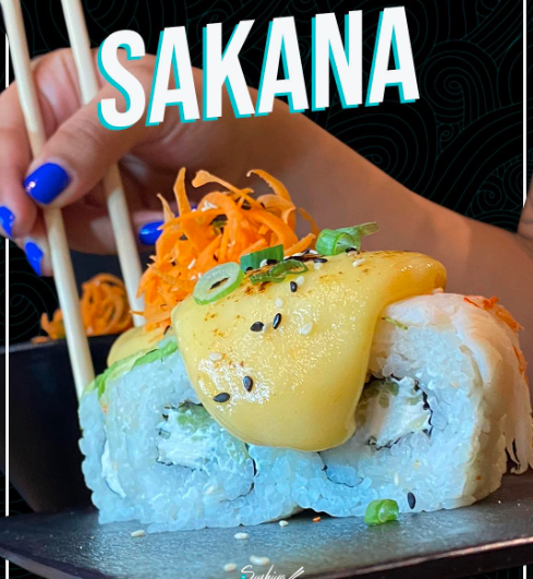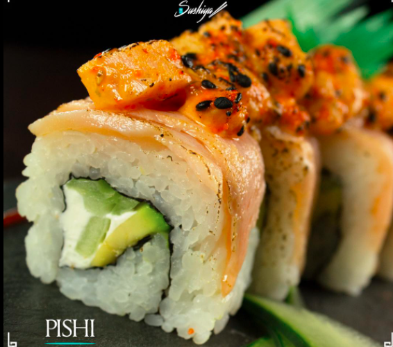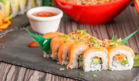 Rollo frío, por dentro pepino, aguacate y queso crema, por fuera cubierto con salmón y una mezcla de Hamachi con masago, furikake y aderezo spicy.