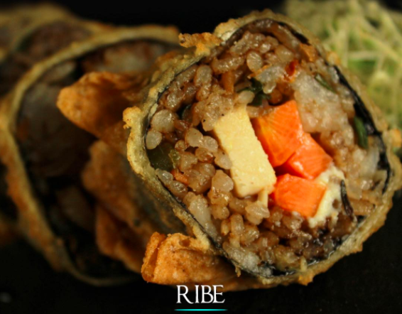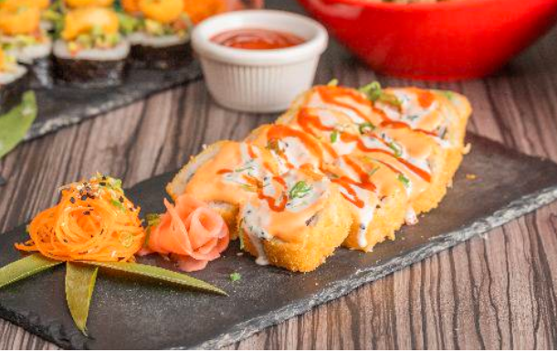 Rollo tempura hecho a base de arroz frito, por dentro pollo a la plancha, tocino frito, zanahoria y queso crema.
