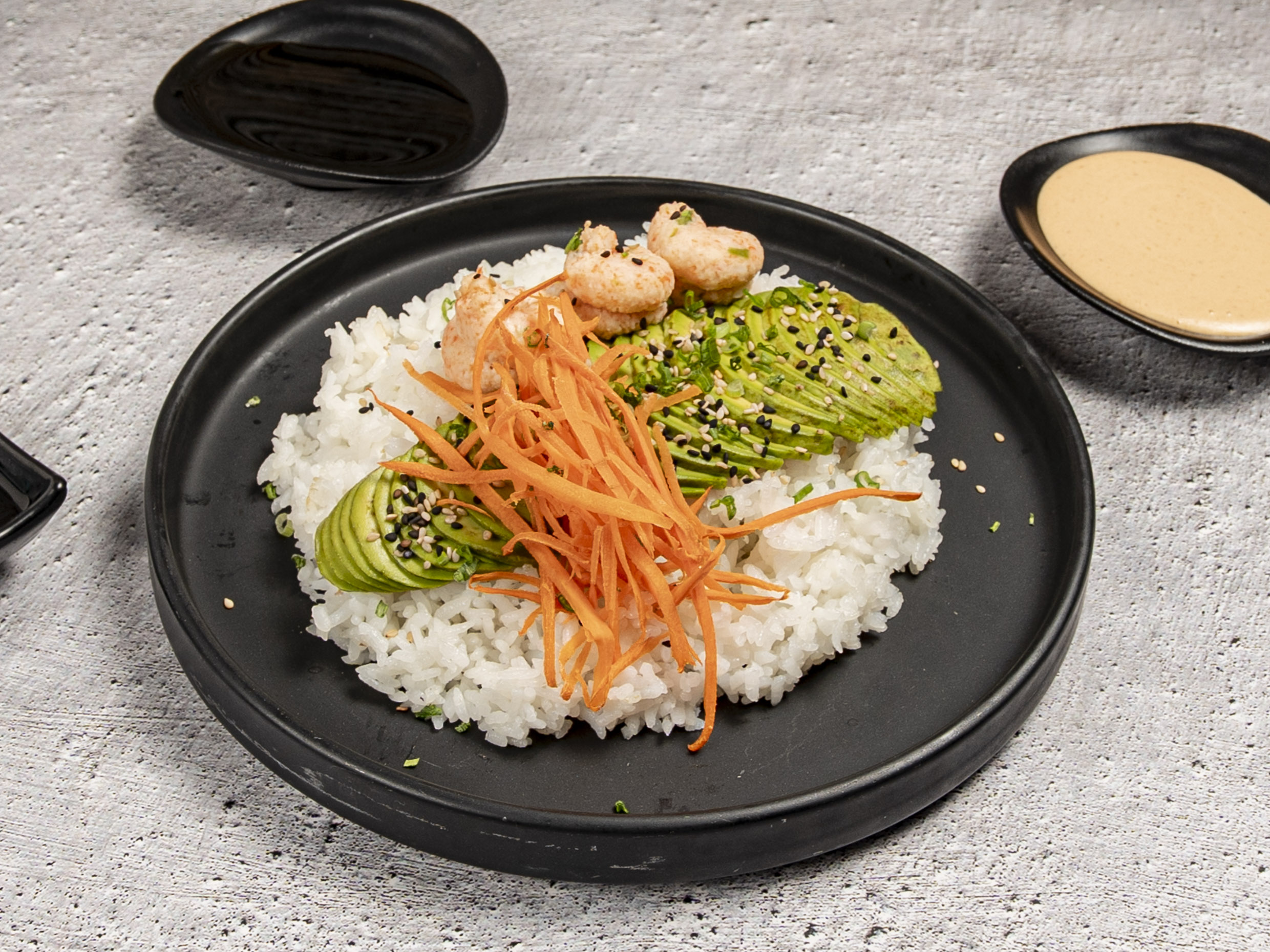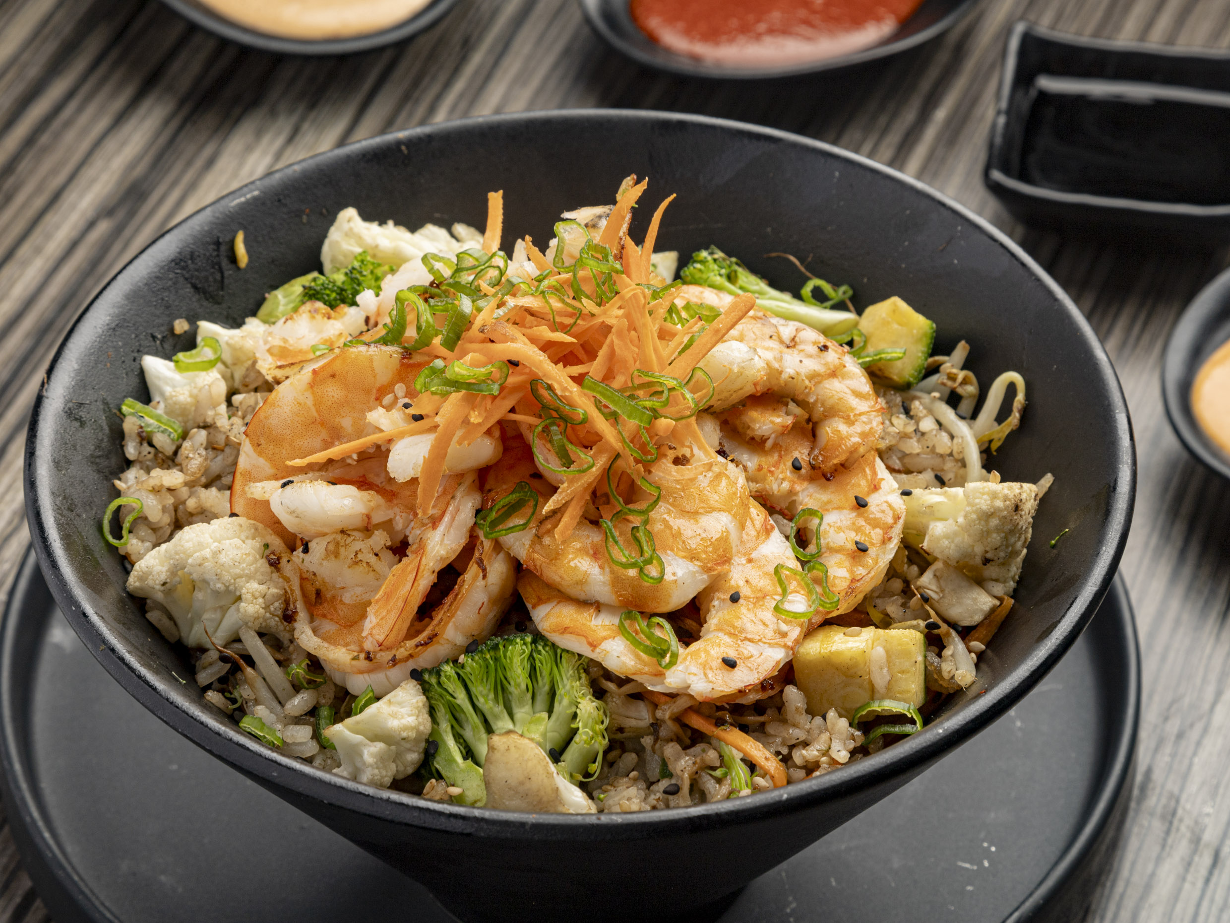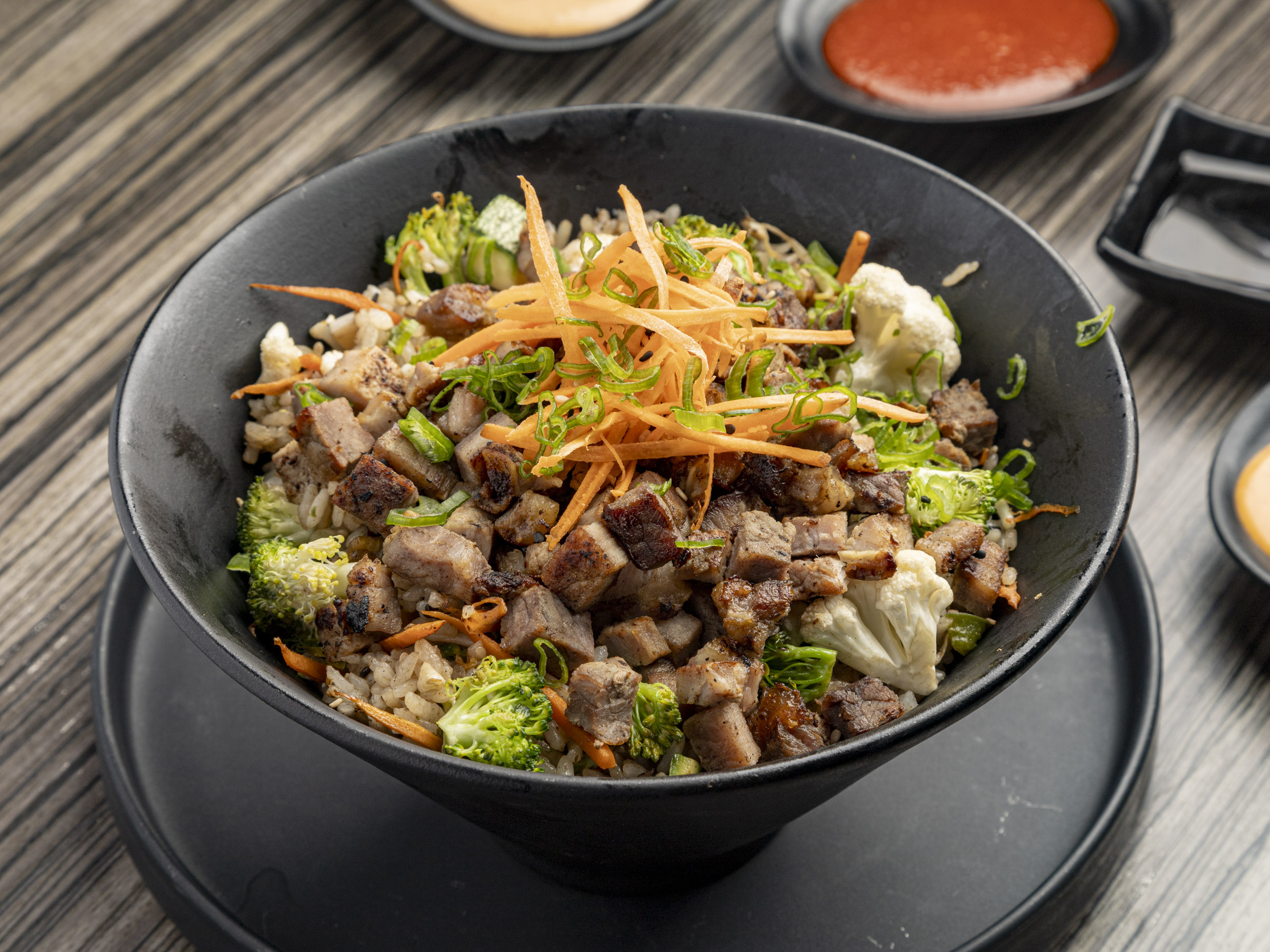 Arroz con verduras, crispy bits, camarón, arrachera y pork bely ahumado con salsa teriyaki.