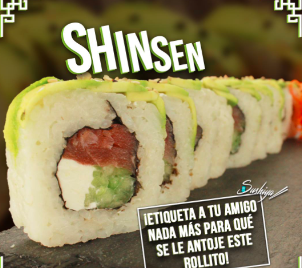 Rollo frío o empanizado, por dentro atún clncostra de togarashi, pepino y queso crema, por fuera cubierto con aguacate y pasta Tampico.