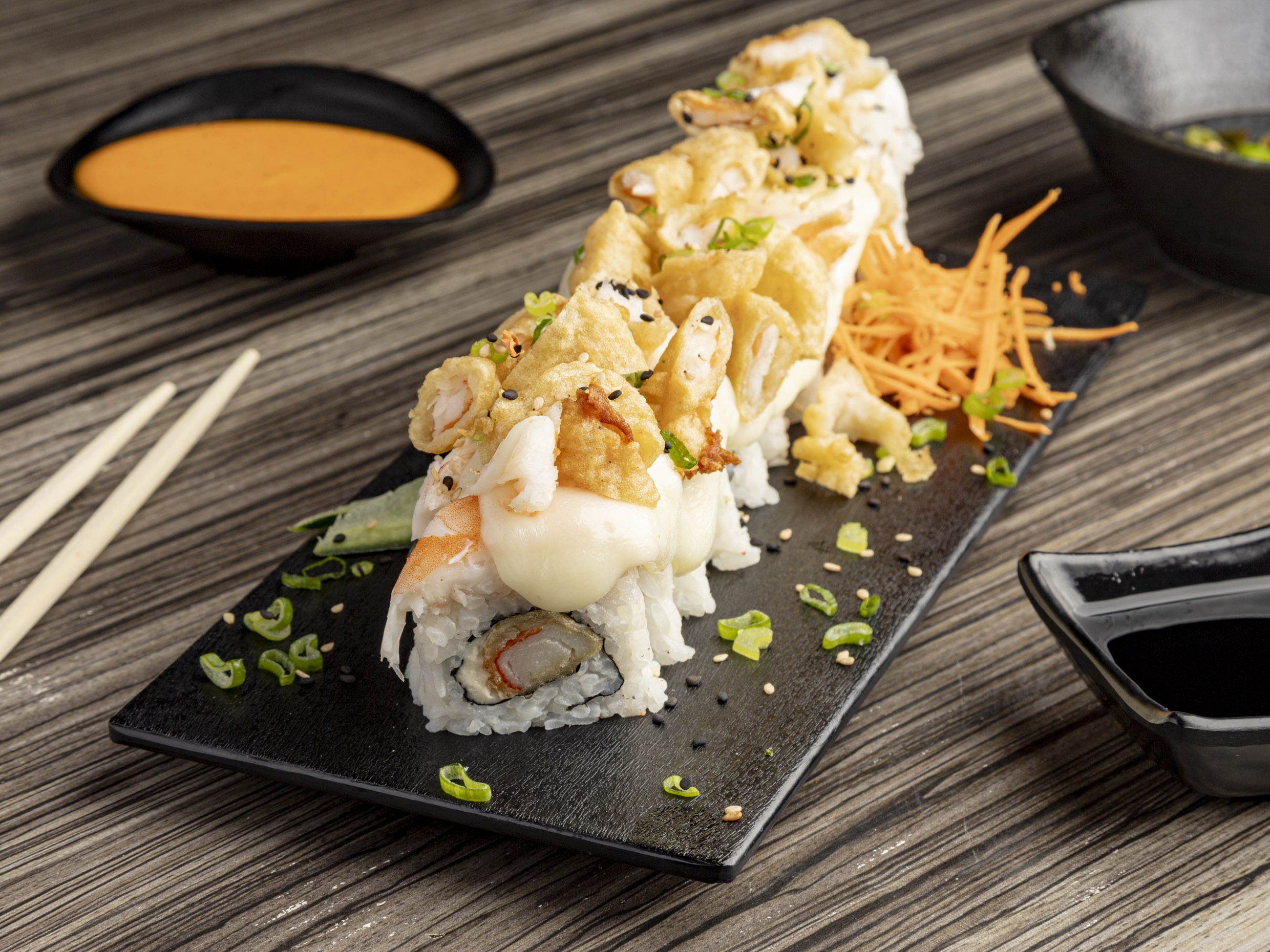 Rollo frío, por dentro surimi tempura y queso crema, por fuera cubierto con camarón fresco, con una mezcla de camarón tempura y chipotle con un mix de quesos.