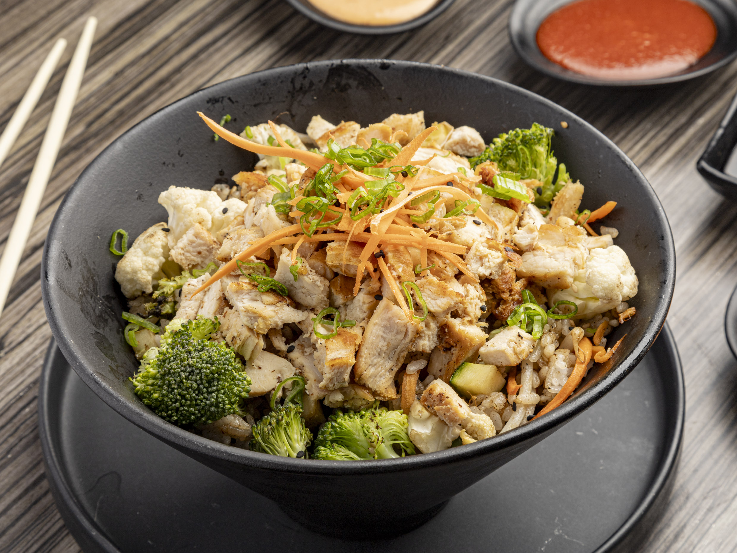 Arroz frito con verduras, con 2 proteínas a elegir (arrachera, camarón y pollo).