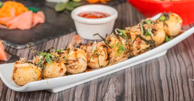 10 bolitas de harina de trigo rellenas de pulpo, cebollín, bonito flakes, salsa tonkatsu y mayonesa ahumada.