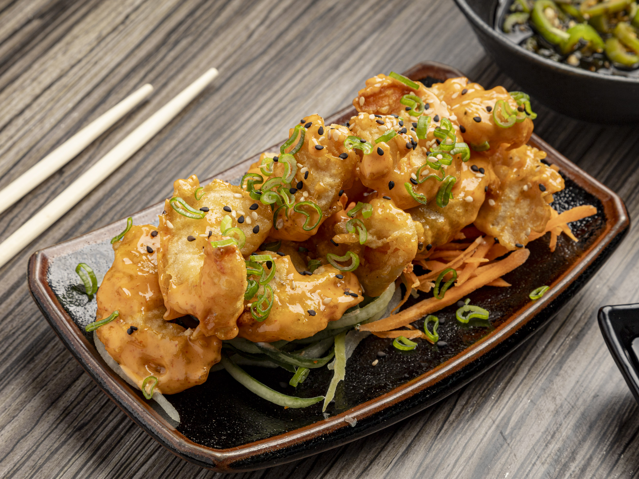 8 piezas de camarón temprura, bañados en salsa spicy y cebollín.