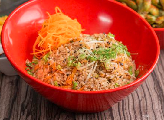 Arroz frito acompañado de verduras, zanahoria, pimiento verde, germen de soya y cebollín.
