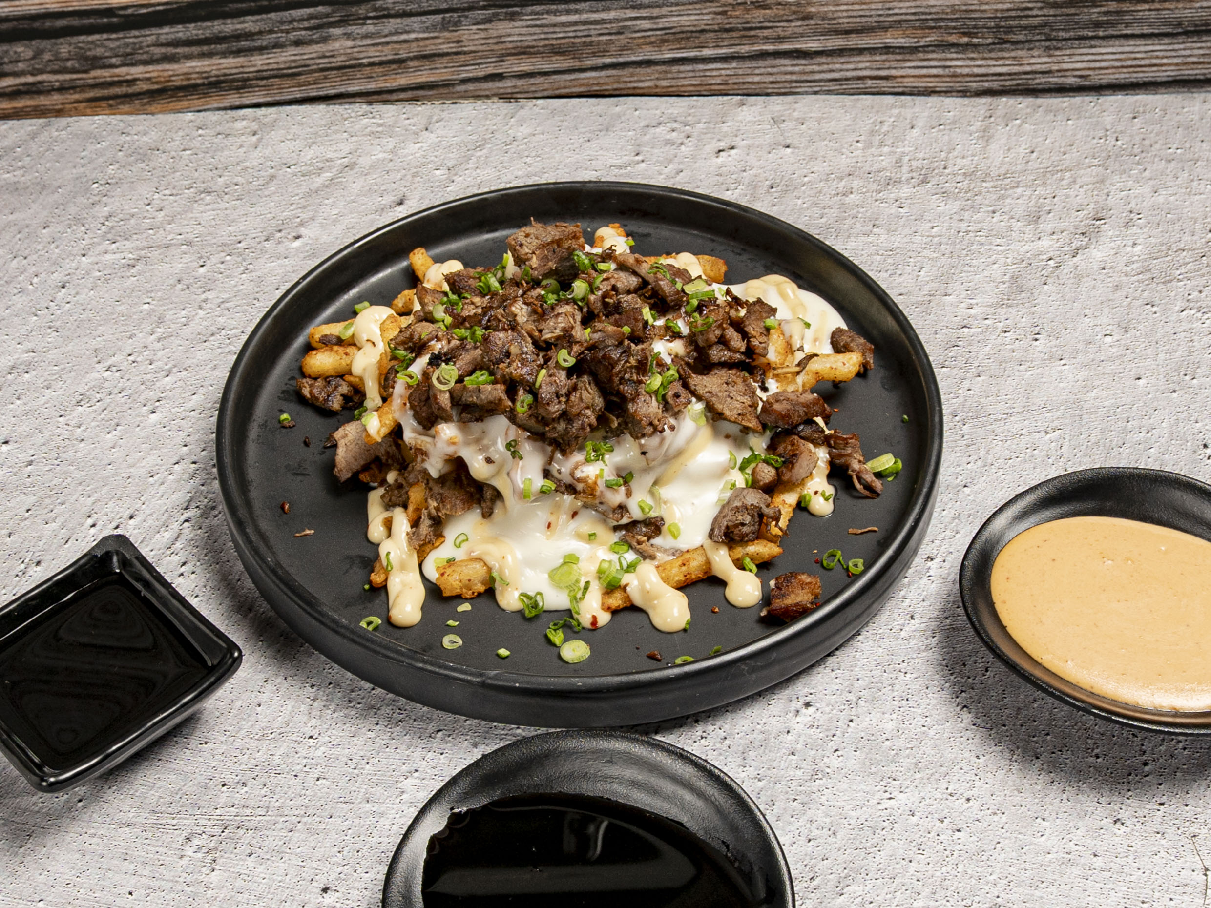 Papas Galeana acompañadas de un mix de quesos fujfidos, cubiertas de una capa de arrachera y bañadas en aderezo de mayonesa ahumada.