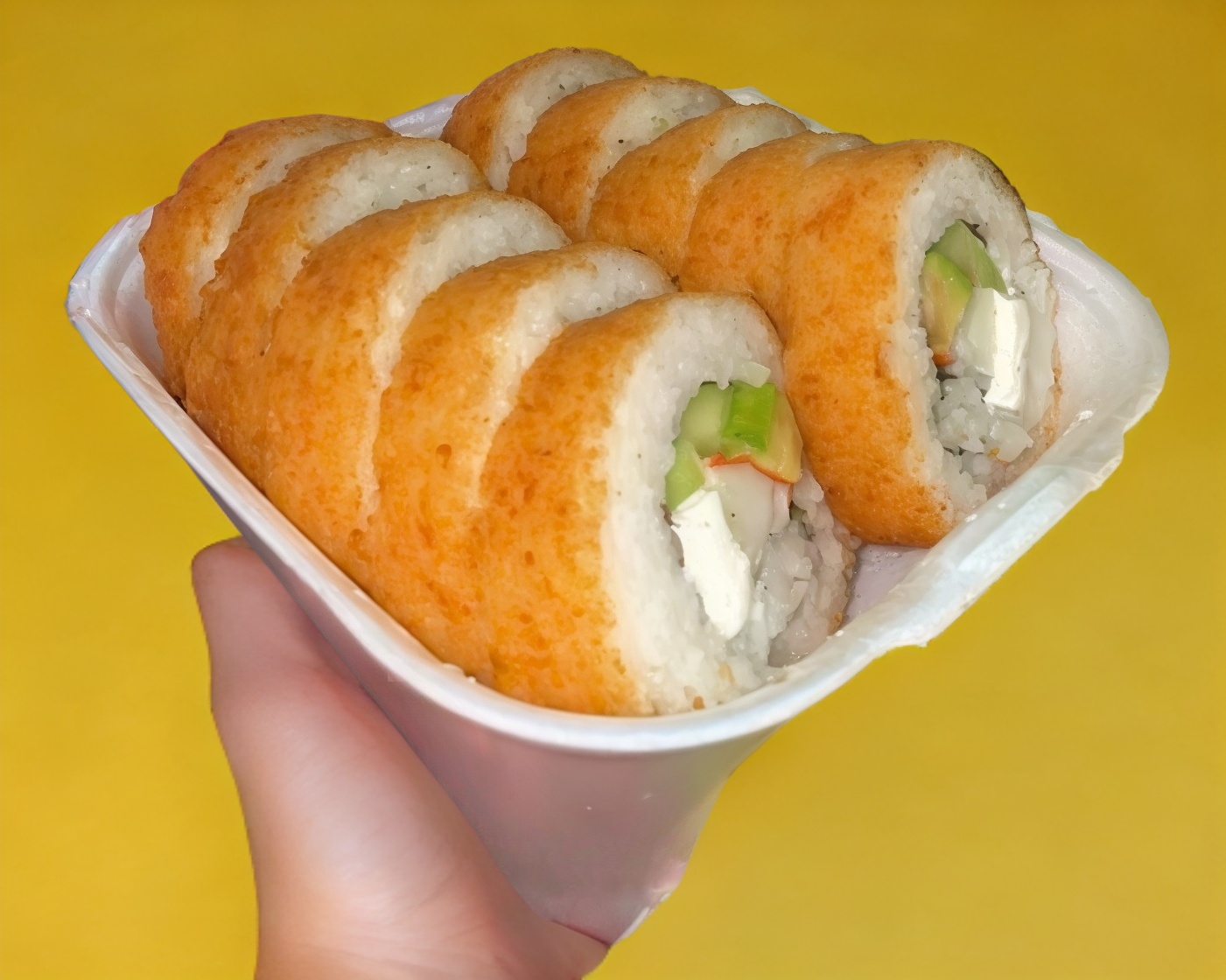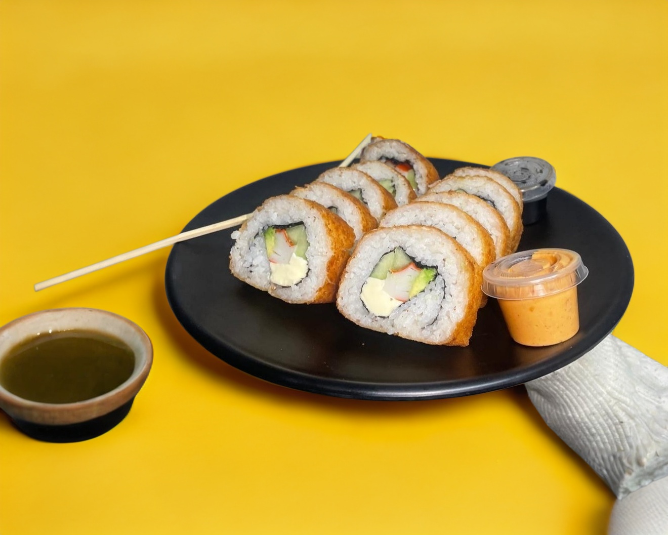 Rollo caliente con surimi, pepino, aguacate, queso crema, empanizado como se muestra en la imagen