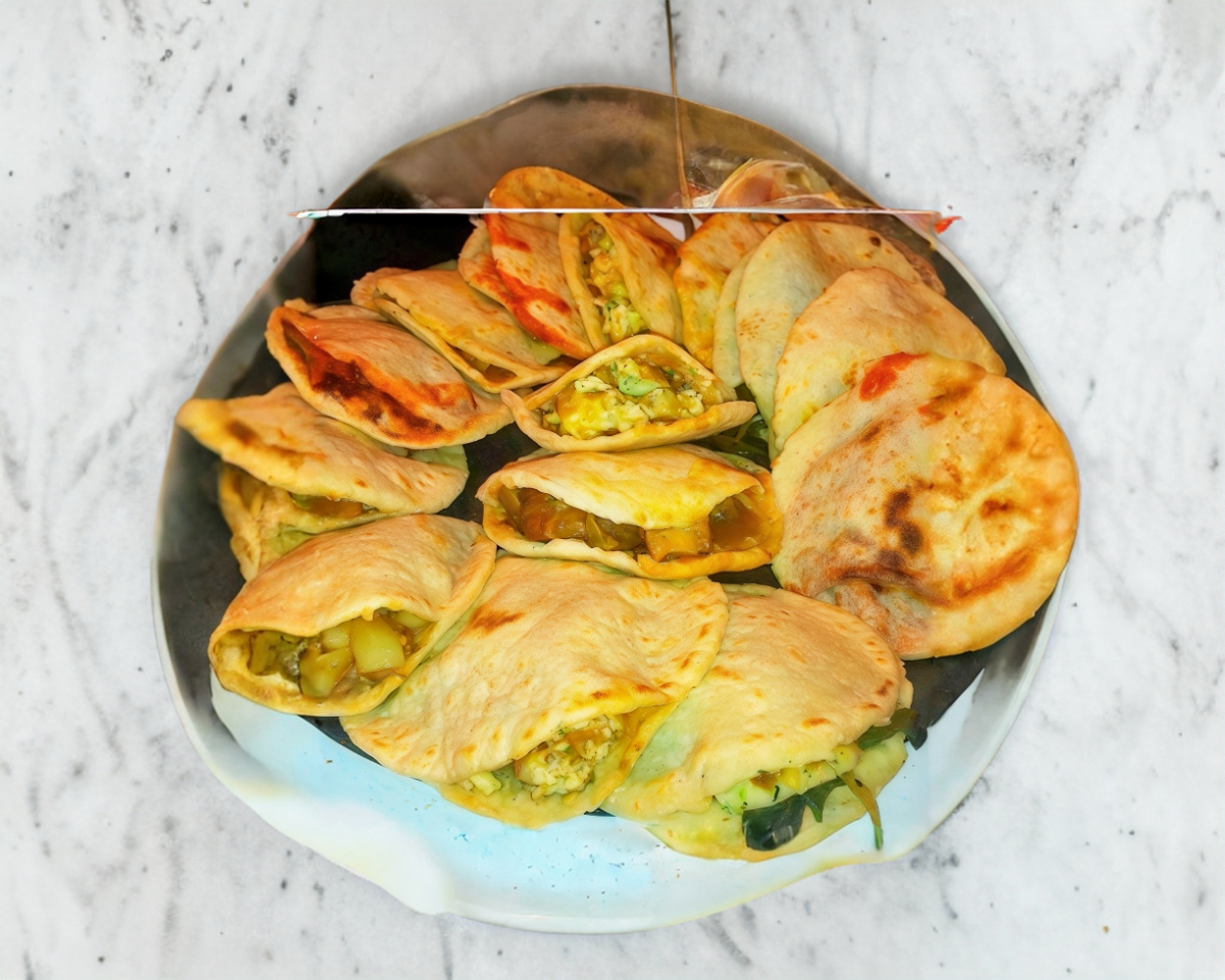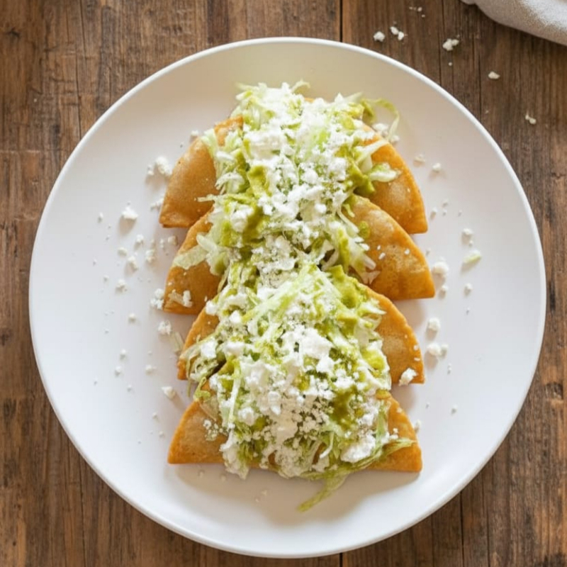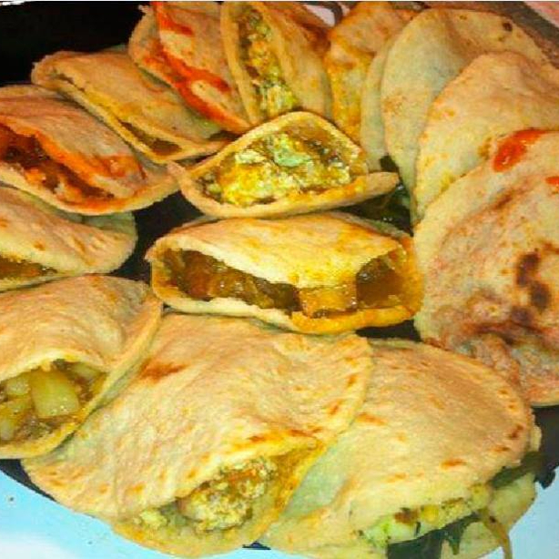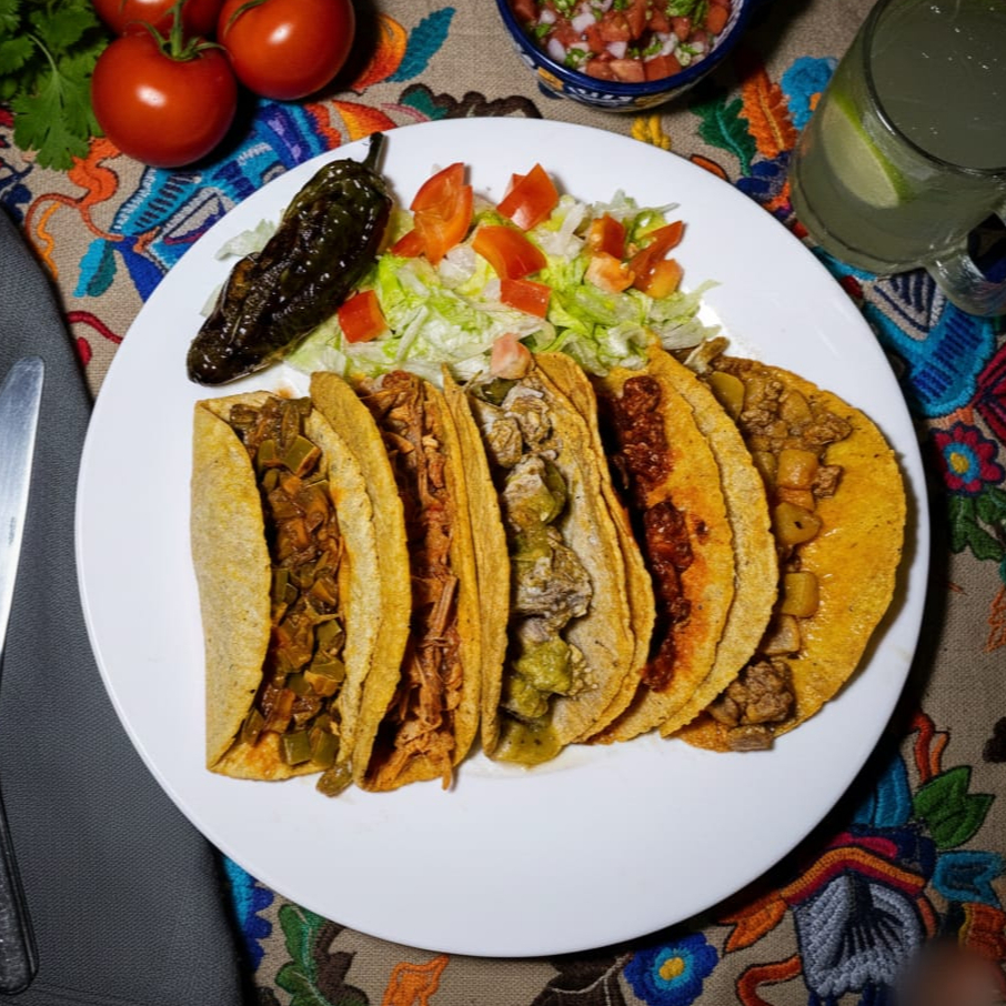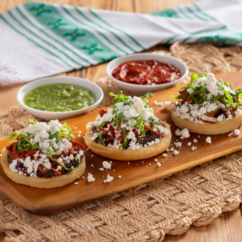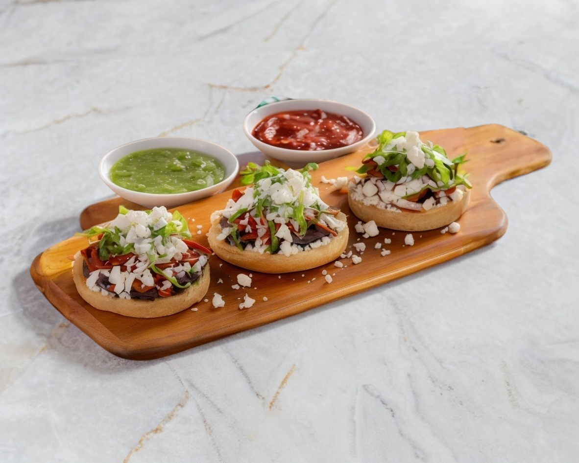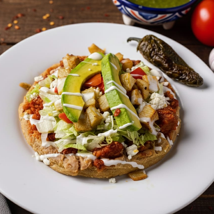 Tortilla tipo sope grande,con base de frijoles y tres guisos a su eleccion, y verduras