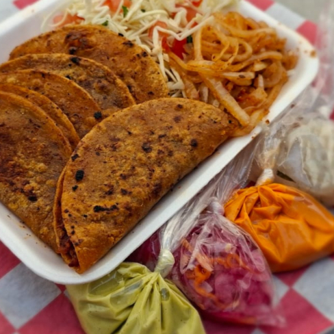 La orden incluye: 5 tacos de papa en tortilla de maíz, la orden viene complementada con repollo, salsa verde cremosa, cueritos, limón y cebolla guisada.