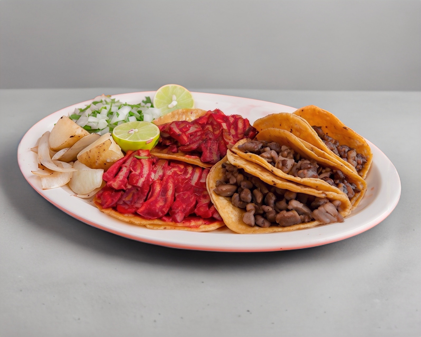 5 Tacos de mixtos de 3 de trompo y 2 de bistec (incluye cebolla asada, salsa, cebolla y cilantro, limones).