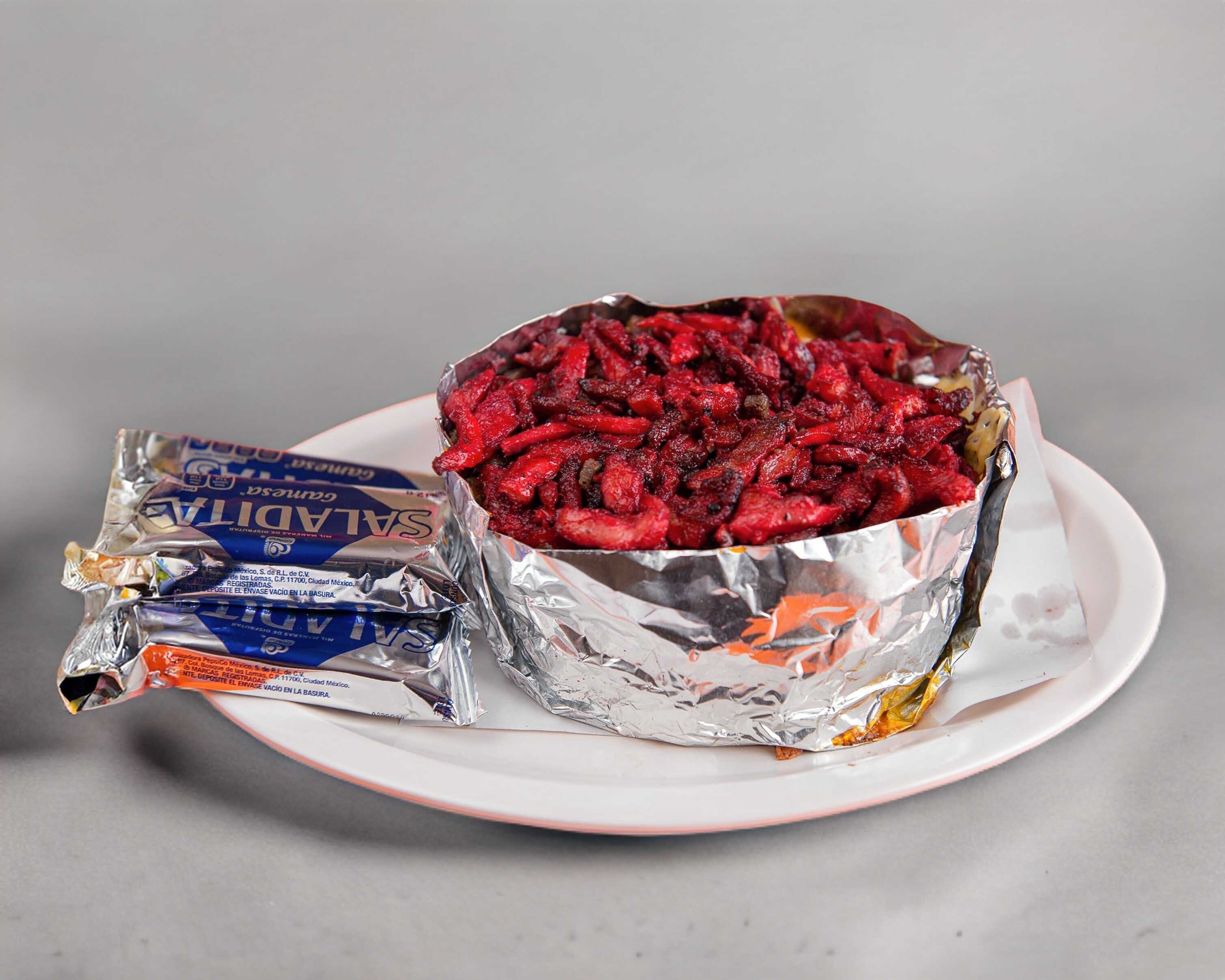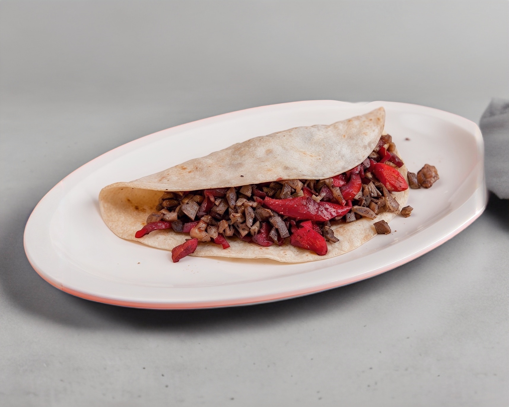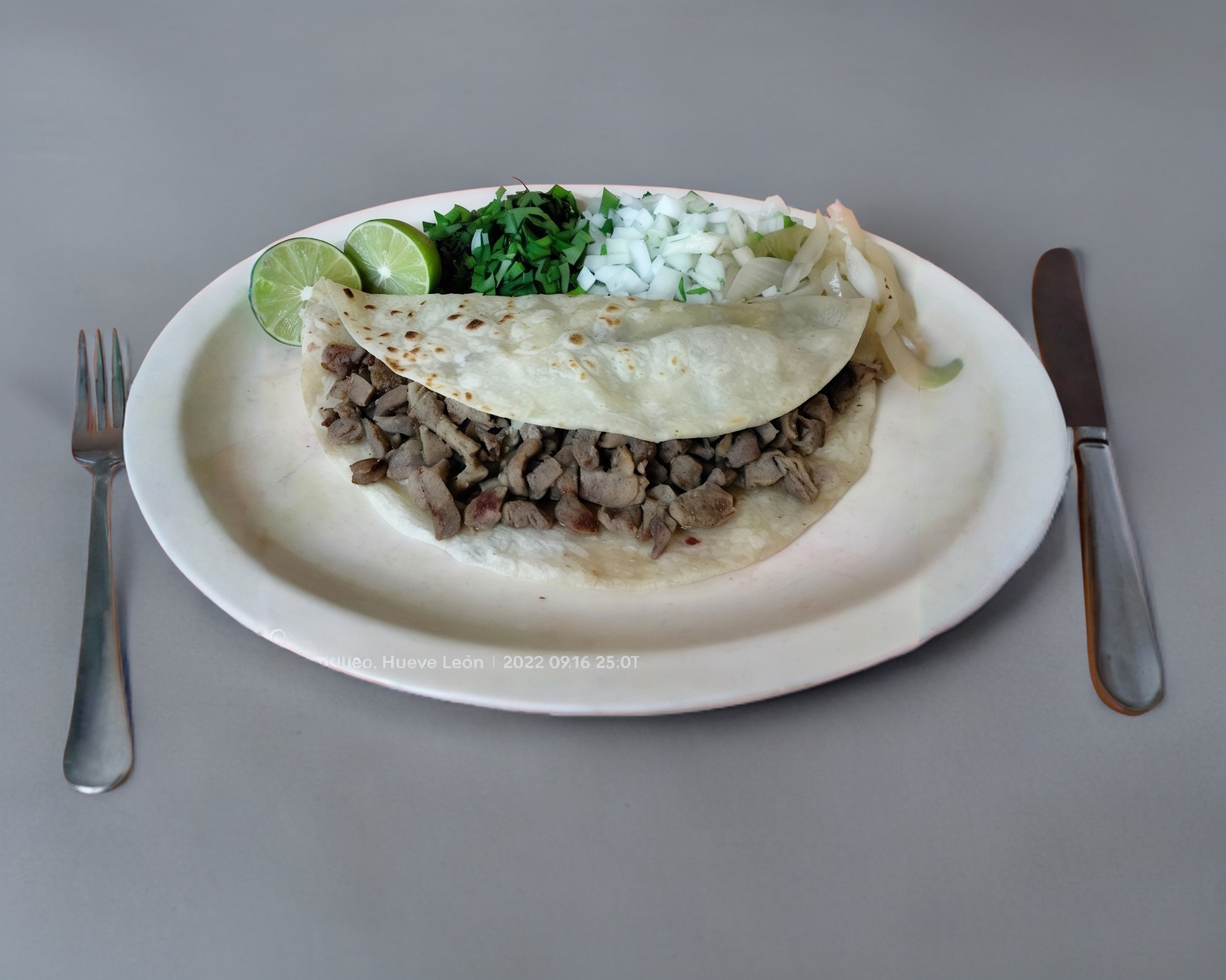 Tortilla de harina mediana, con carne de bistec y queso (incluye cebolla asada, salsa, cebolla y cilantro, limones).