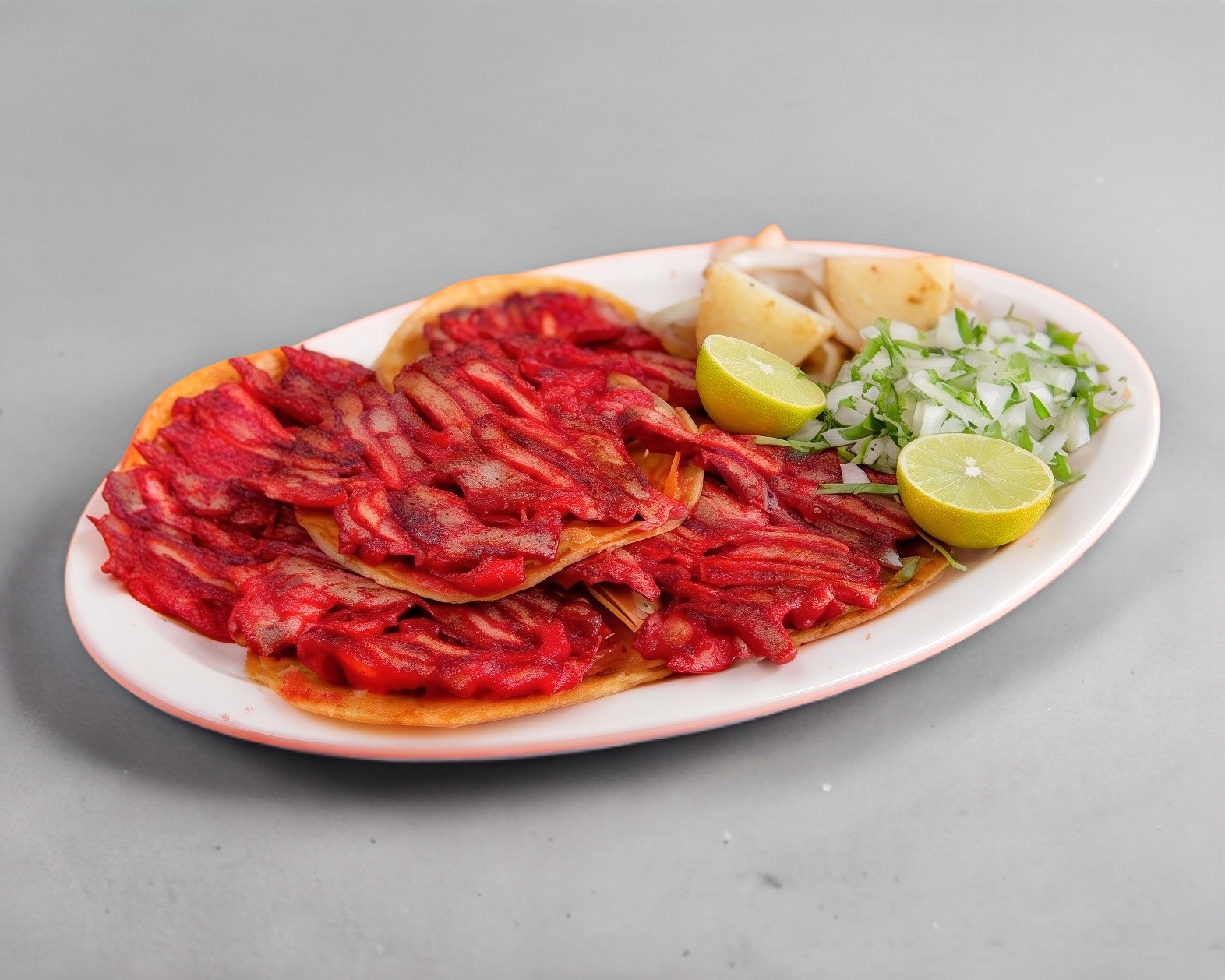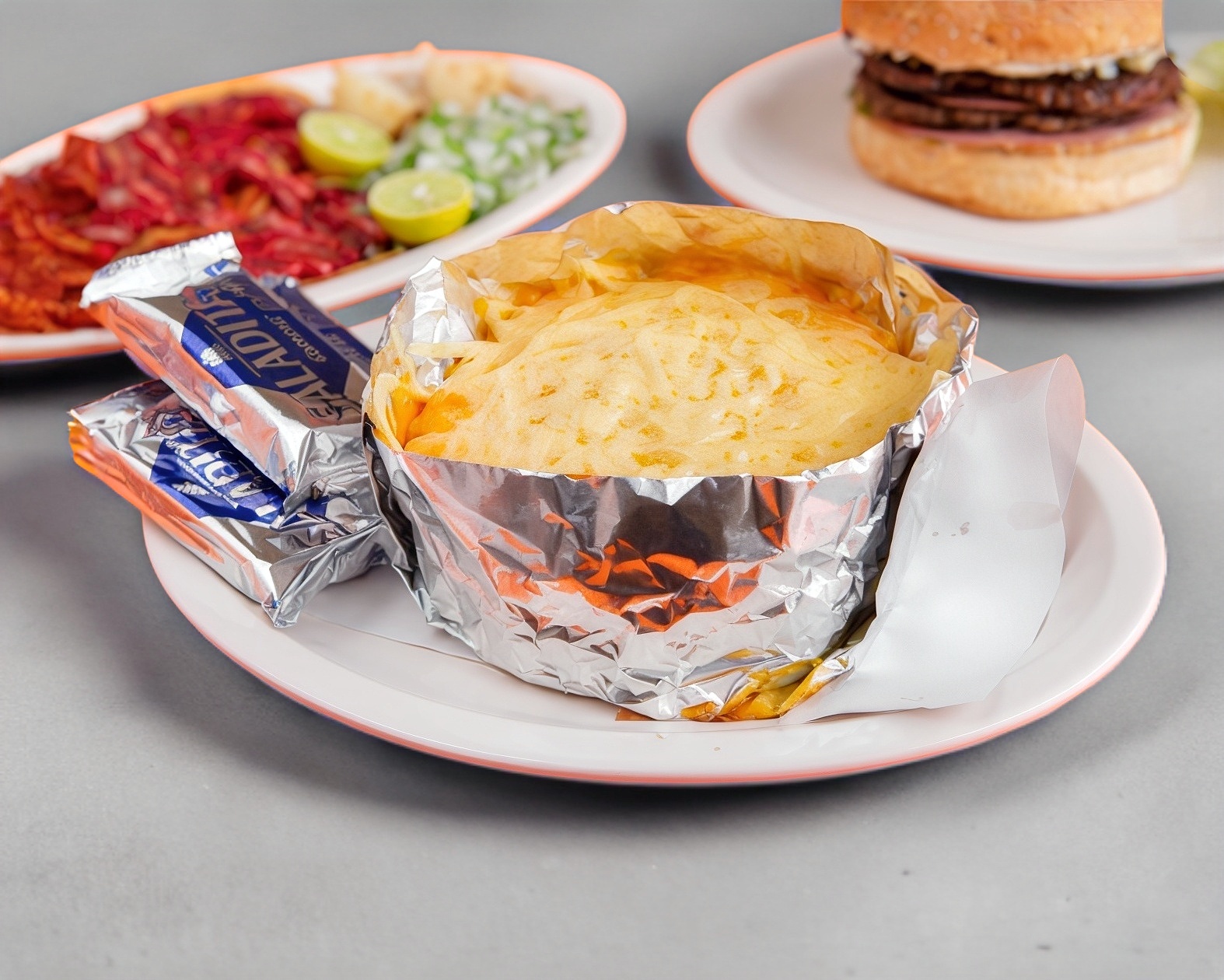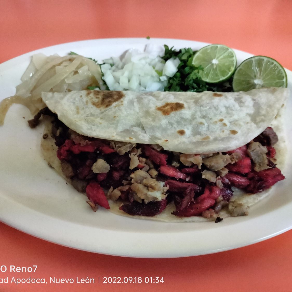 Tortilla de harina mediana, con carne de trompo y bistec y queso (incluye cebolla asada, salsa, cebolla y cilantro, limones).