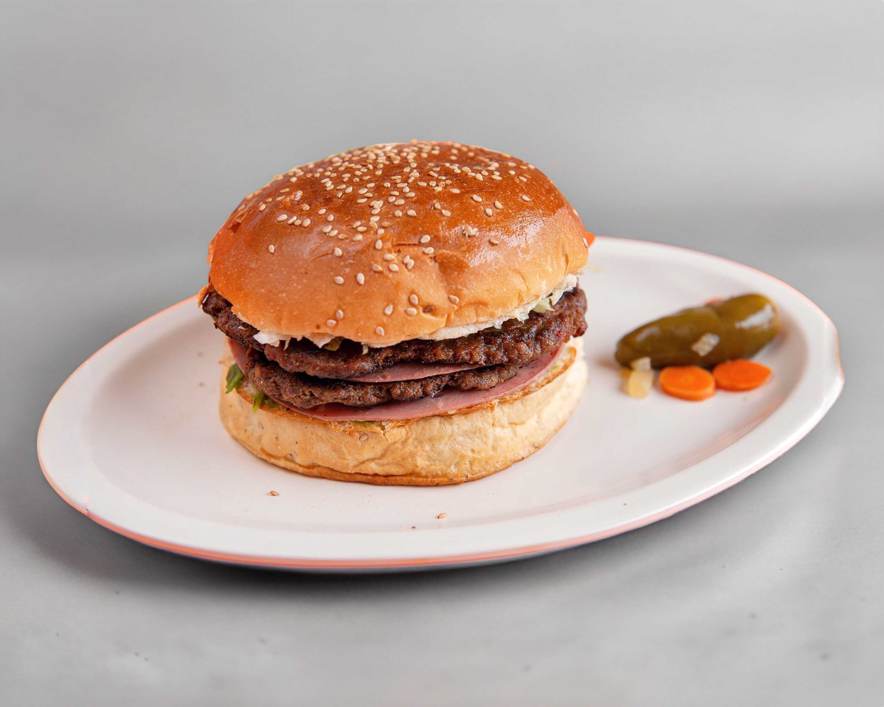 Doble carne casera 100%, doble jamón, doble queso, aguacate, lechuga, tomate, cebolla, aderezo y cátsup.