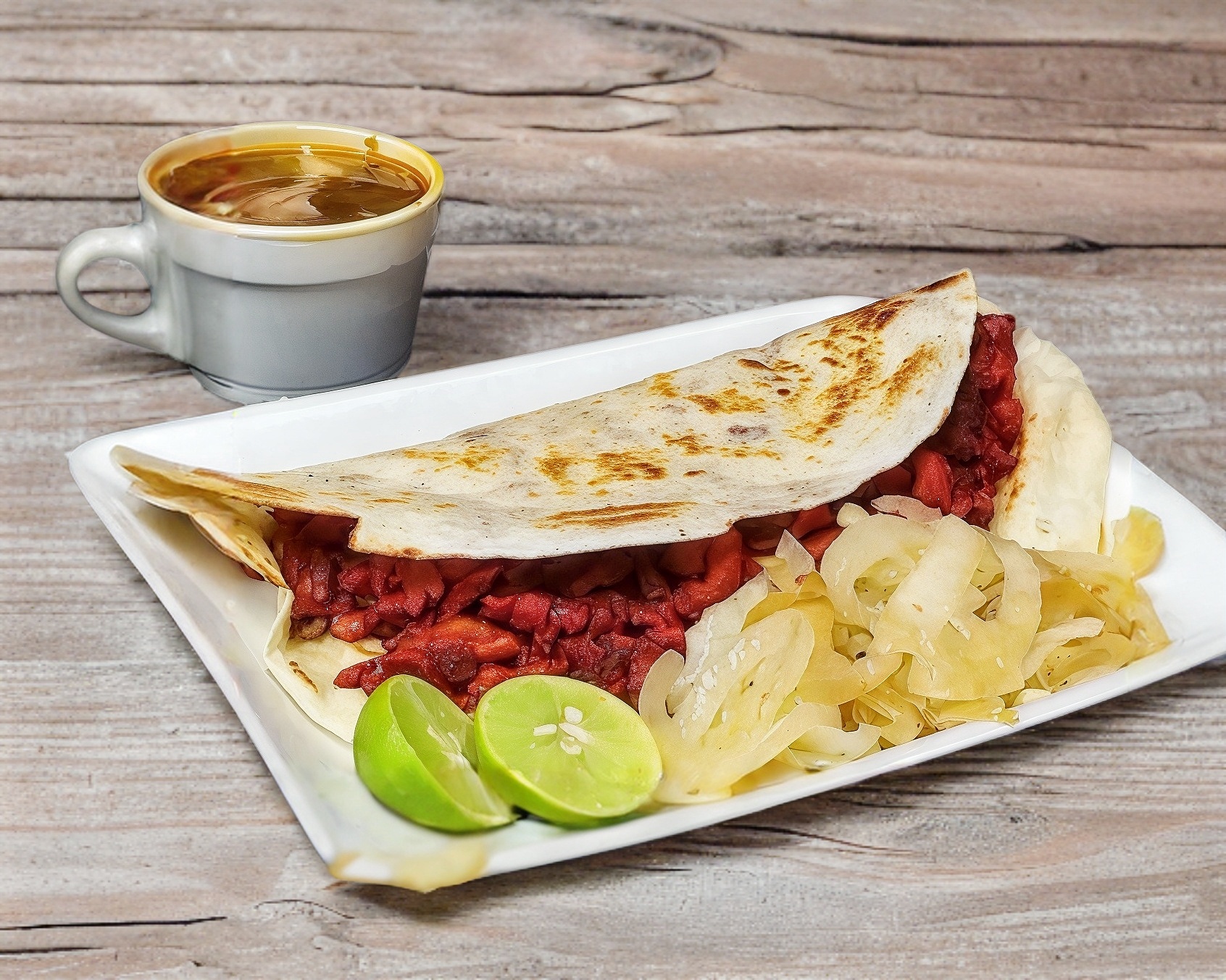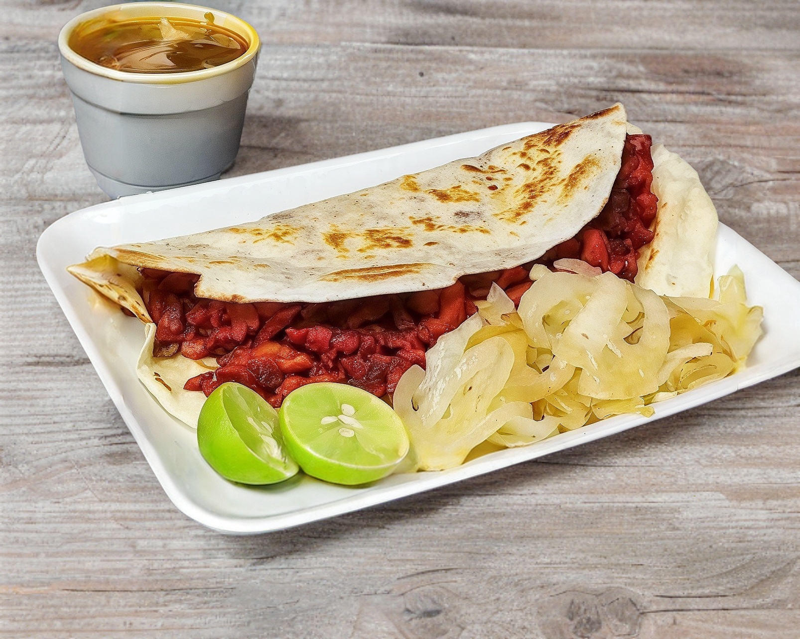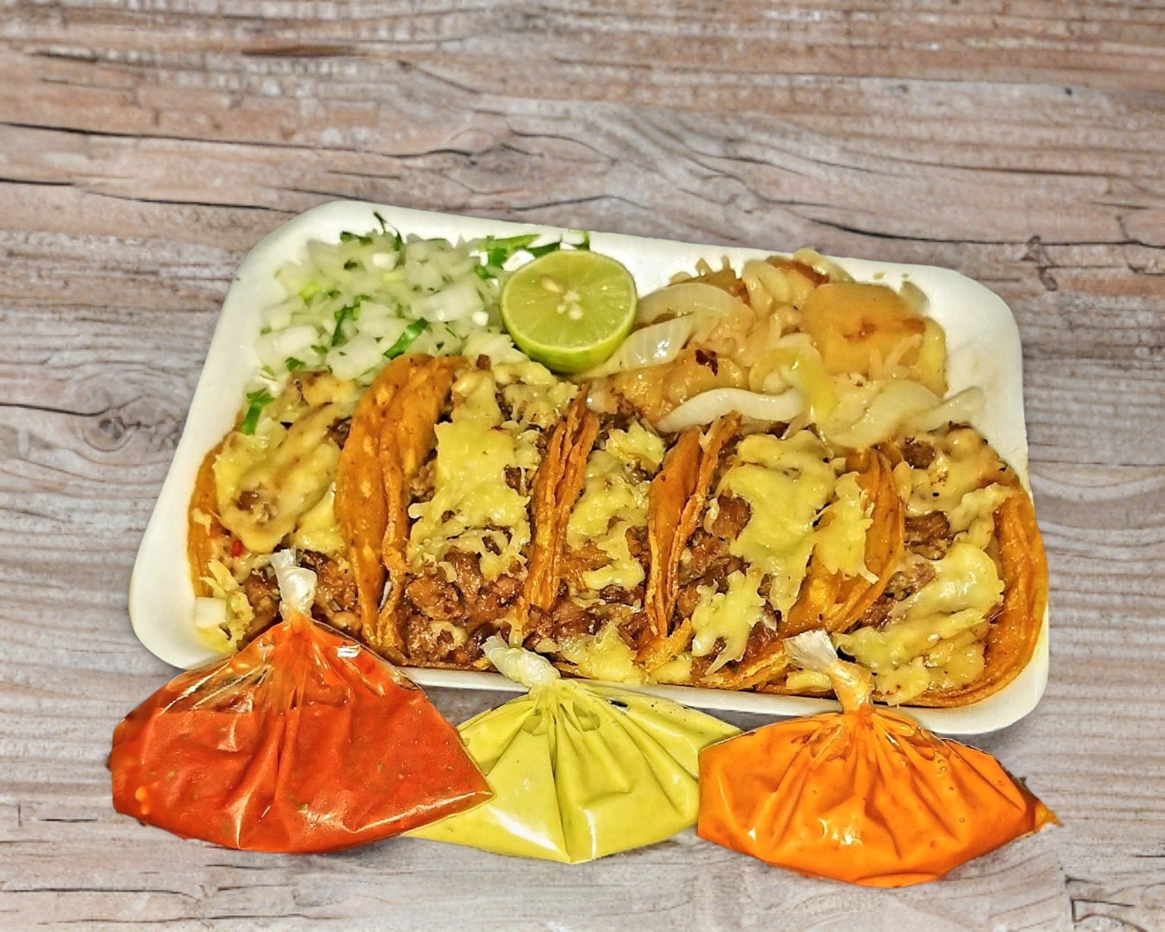 Tortilla de harina con queso asadero, carne de trompo y bistec, acompañada de cebolla cocida, limones y salsas roja, verde y anaranjada.