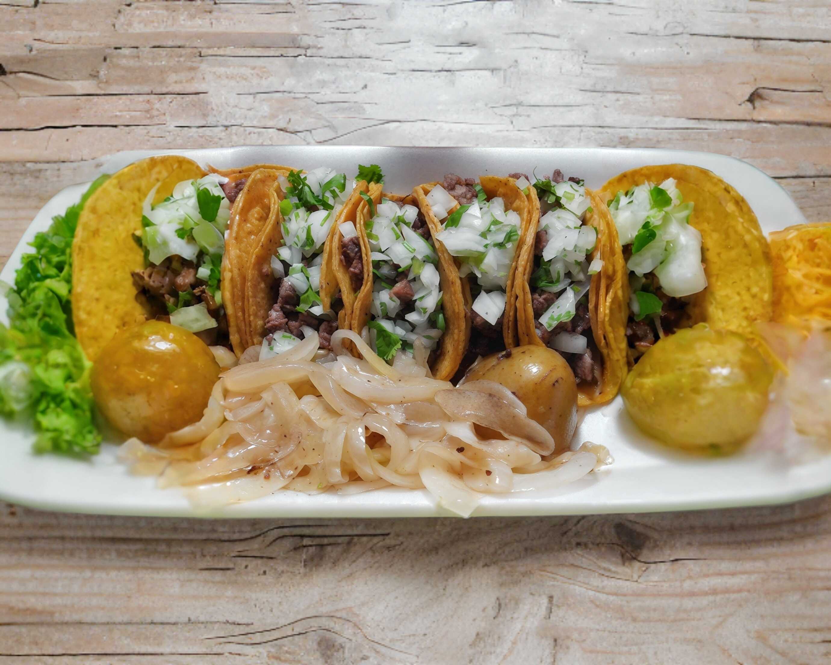 Tortilla con carne de bistec con queso asadero gratinado acompañado de cebolla cocida y papa cocida.