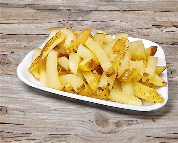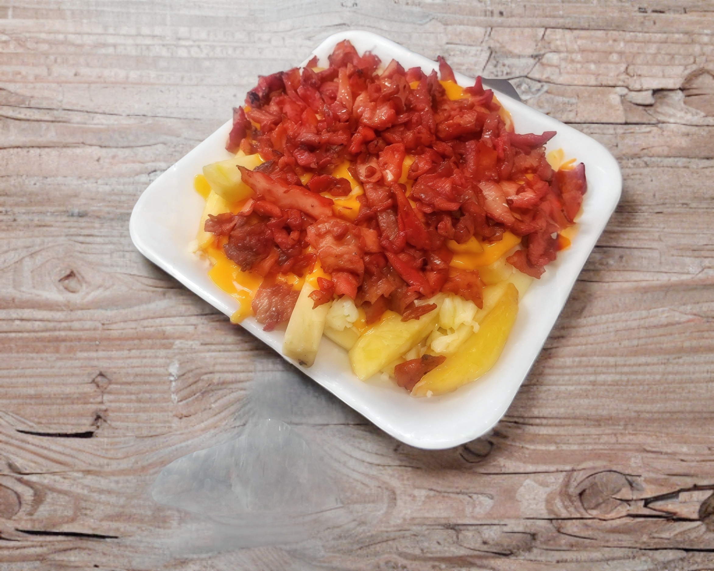 Papas a la francesa con carne de trompo, queso asadero y queso amarillo.