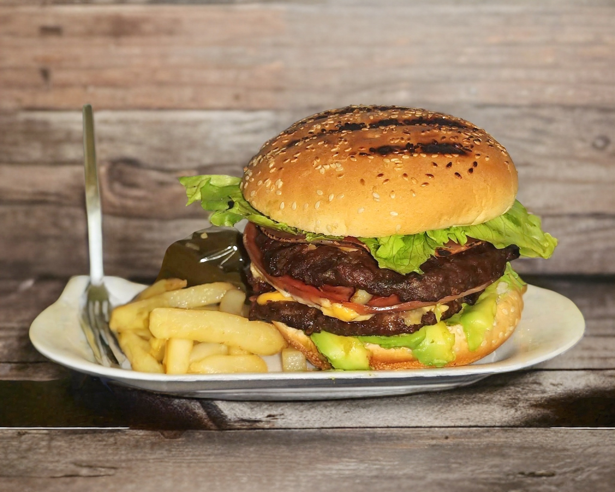 Pan parrillero con aguacate, aderezos, dos camas de carne con jamón y rebanada de queso, con jamón, lechuga.