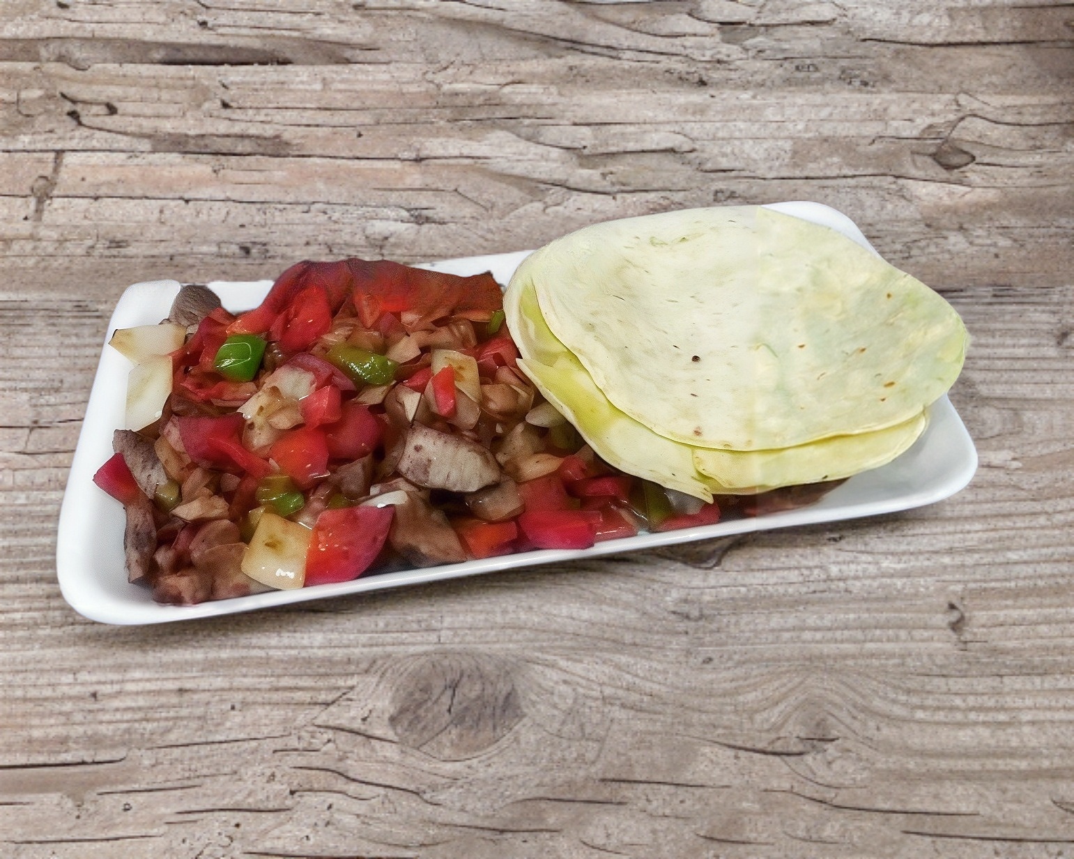 1 porción personal Platillo con carne de asada o mixta con trompo, salchicha para asar, pimiento, cebolla, 5 tortillas de maíz , salsa roja y verde y anaranjada