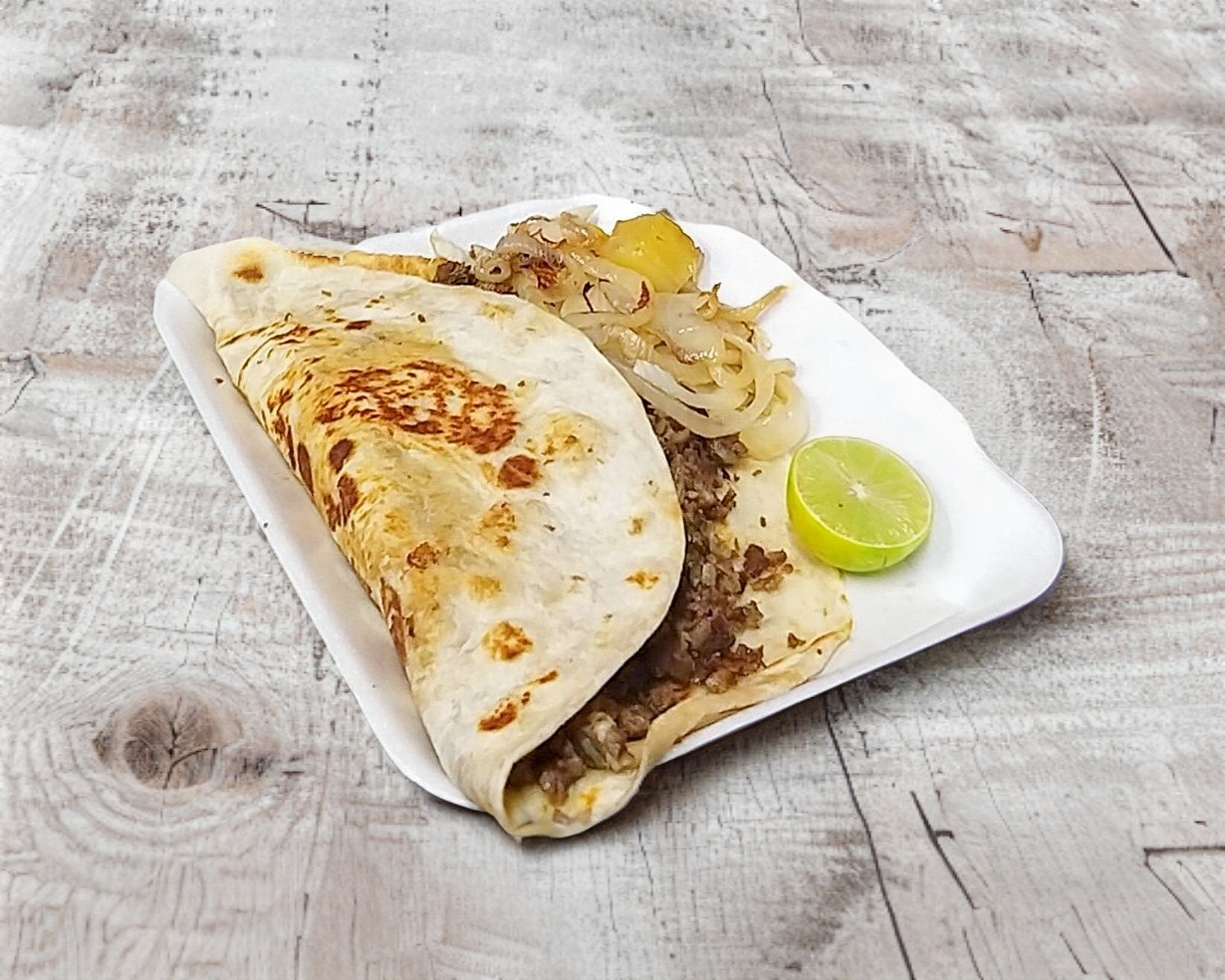 Tortilla grande de harina de 24 cm de diámetro con carne de res con queso gratinado acompañado de cebolla cocida y papa cocida, salas, cebolla y cilantro.