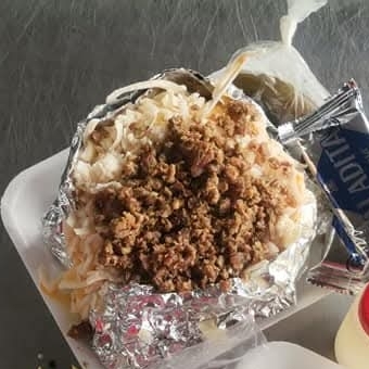 Papas a la francesa con queso amarillo, queso blanco y trompo