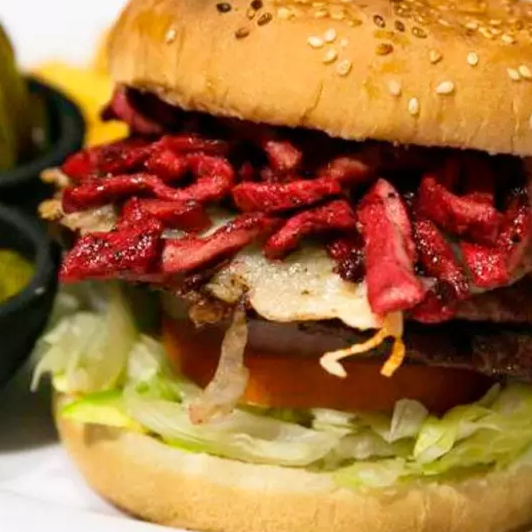Hamburguesa de carne de res con carne de trompo, jamón, queso tipo americano y lechuga.