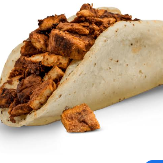 Tortilla de harina acompañada de carne de trompo, queso asadero y salsa.