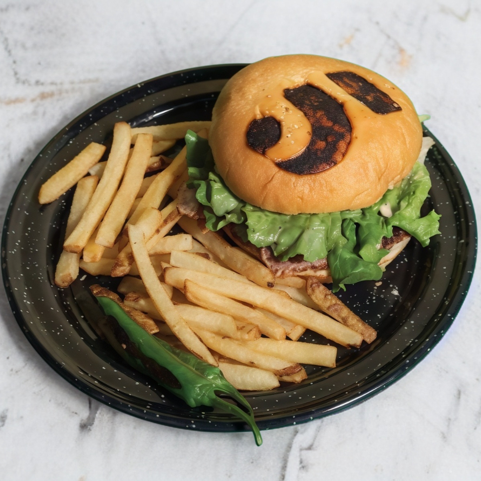 180 GR CARNE, TOCINO, CEBOLLA FRITA, TOMATE, LECHUGA, ADEREZO A ESCOGER COSTRA DE LA CASA. ACOMPAÑADO CON PAPAS FRITAS