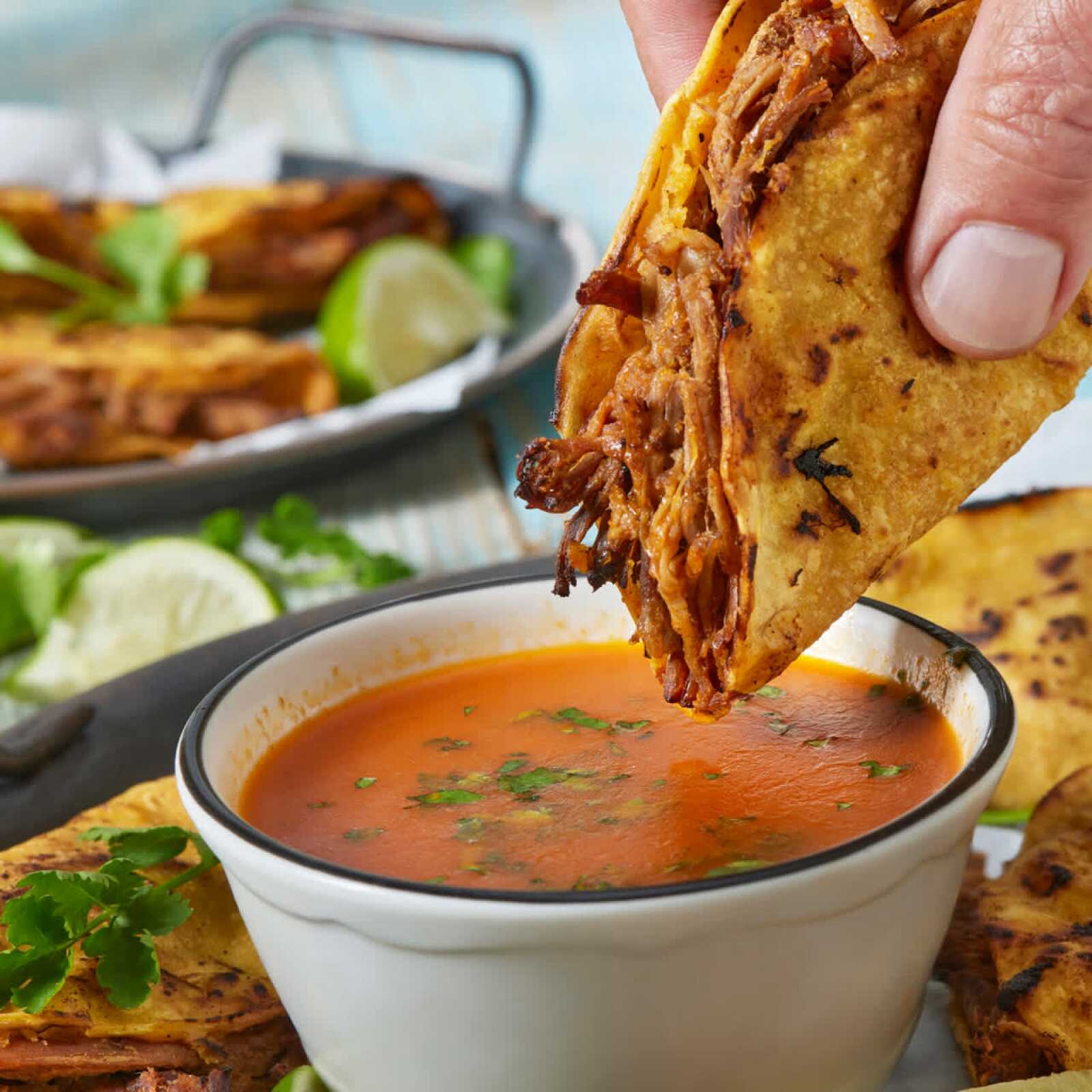Rico Taco de Birria de Res, bañado y dorado en su propio consomé, Dándole ese sabor peculiar 100% TAPATIO.