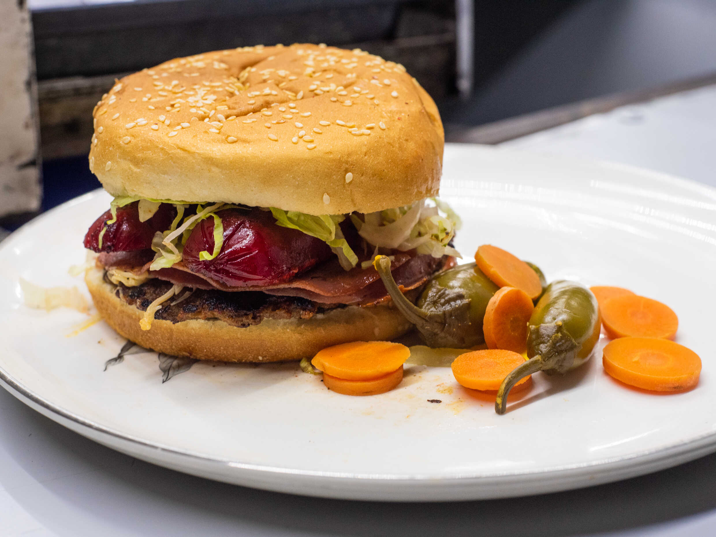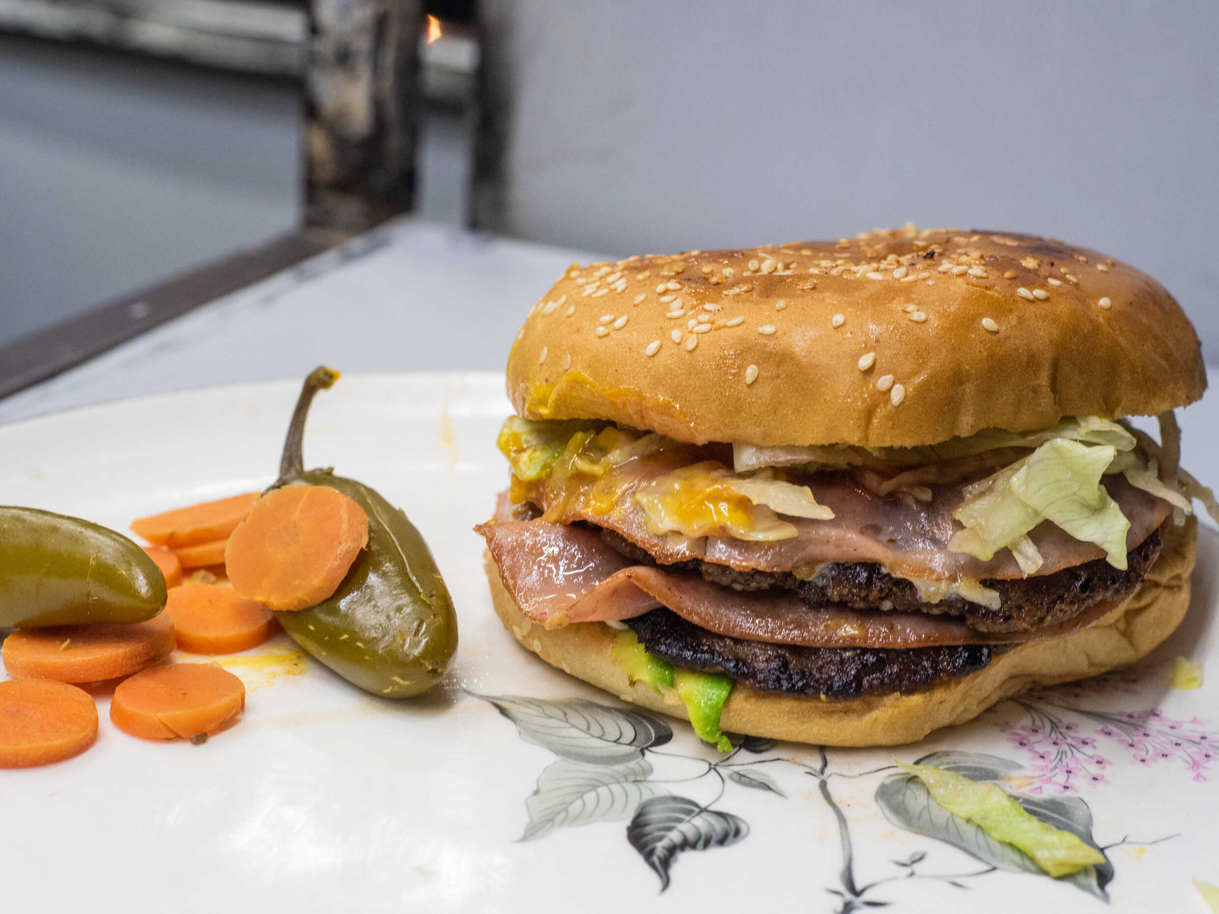 Ingredientes: Doble carne casera, aguacate, doble jamón, doble queso asadero, mayonesa, catsup, chiles jalapeños.