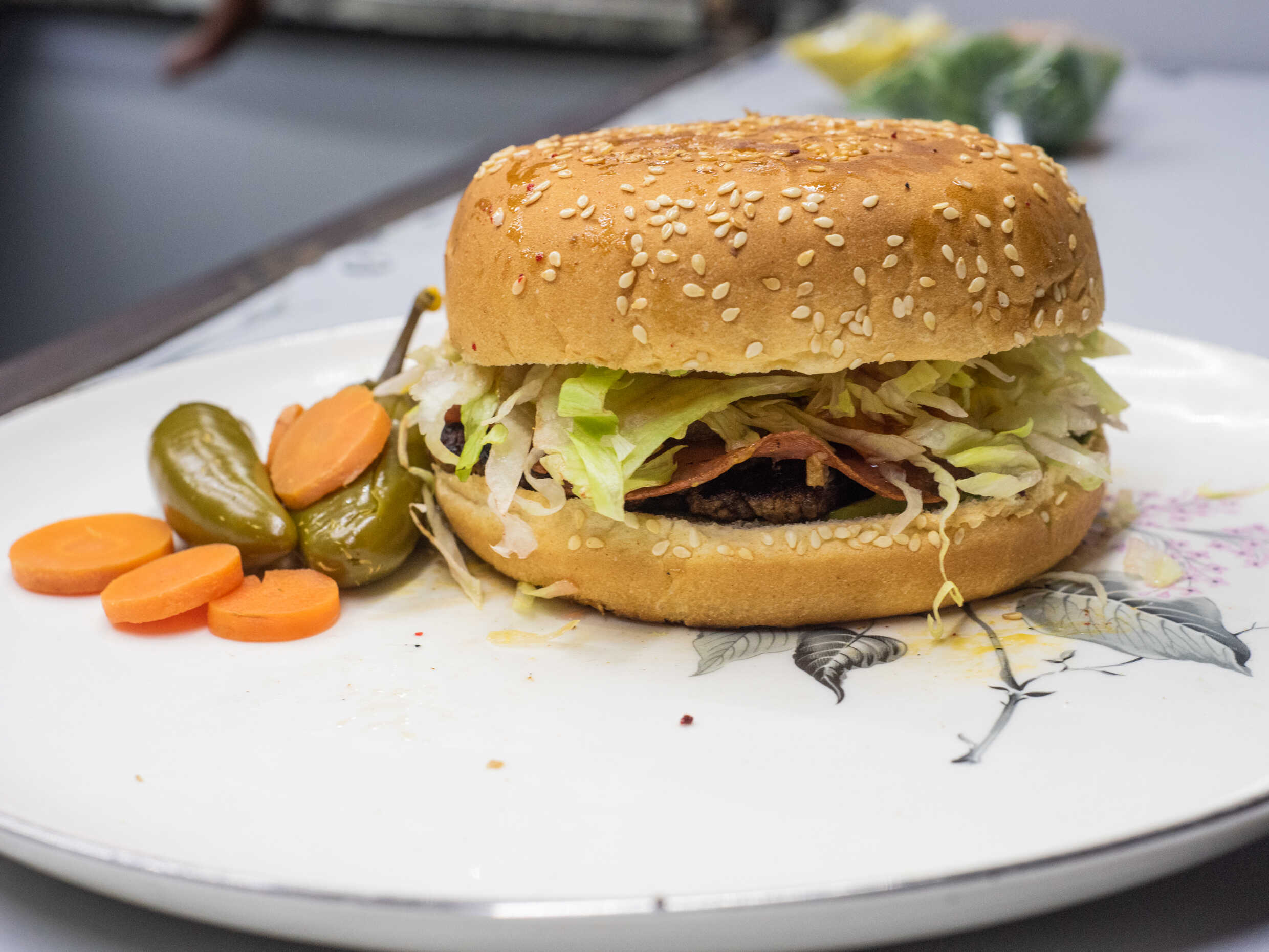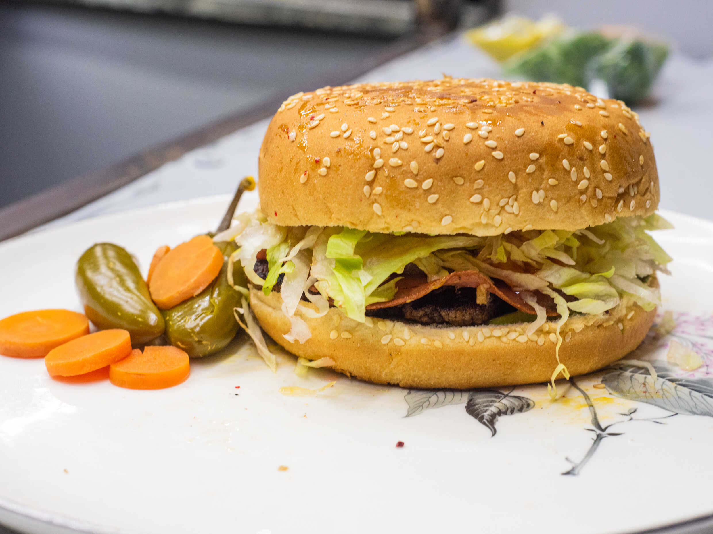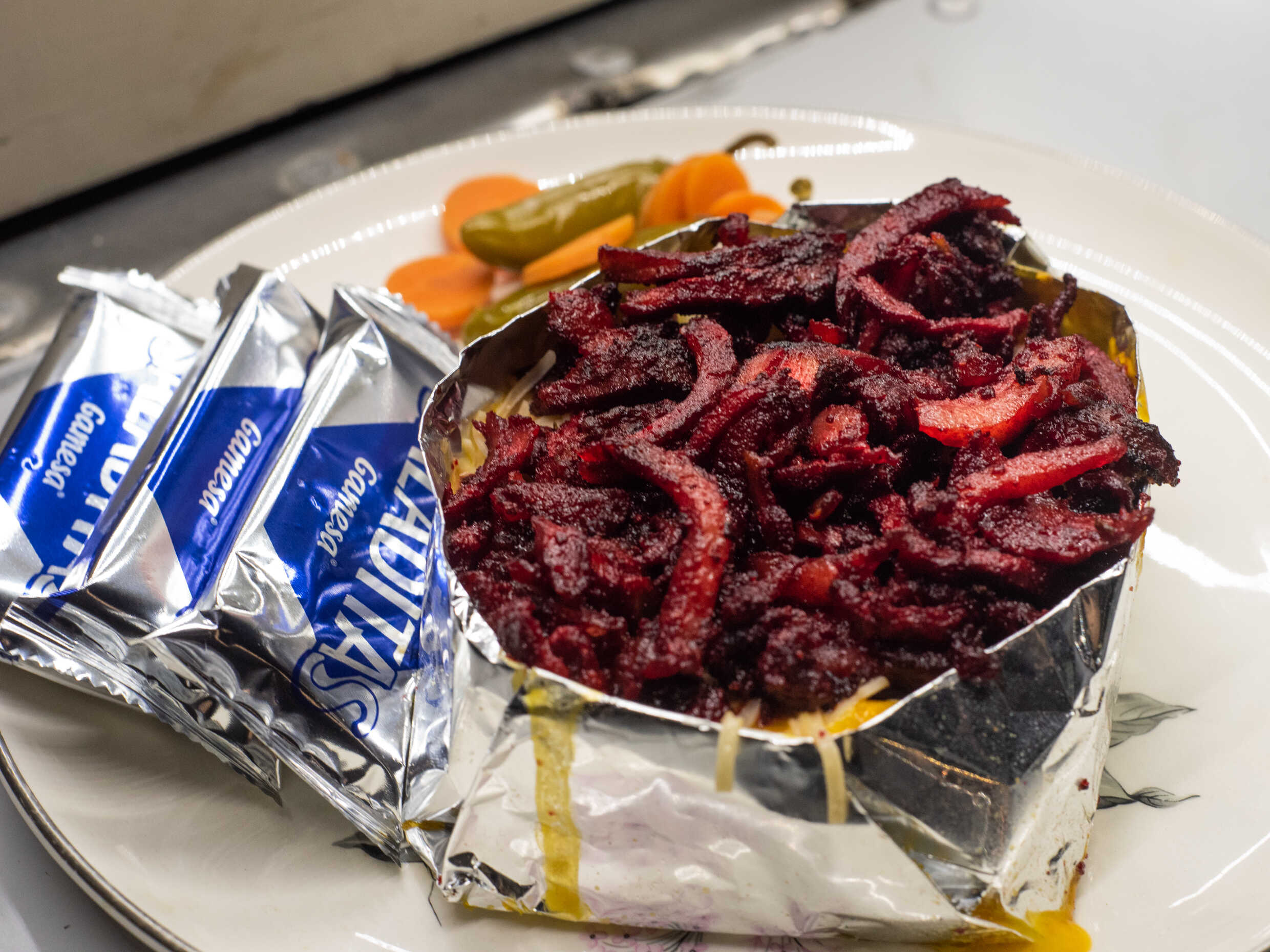 Ingredientes: Carne casera, gran porción de trompo, aguacate, jamón, queso asadero, mayonesa, cátsup, chiles jalapeños.