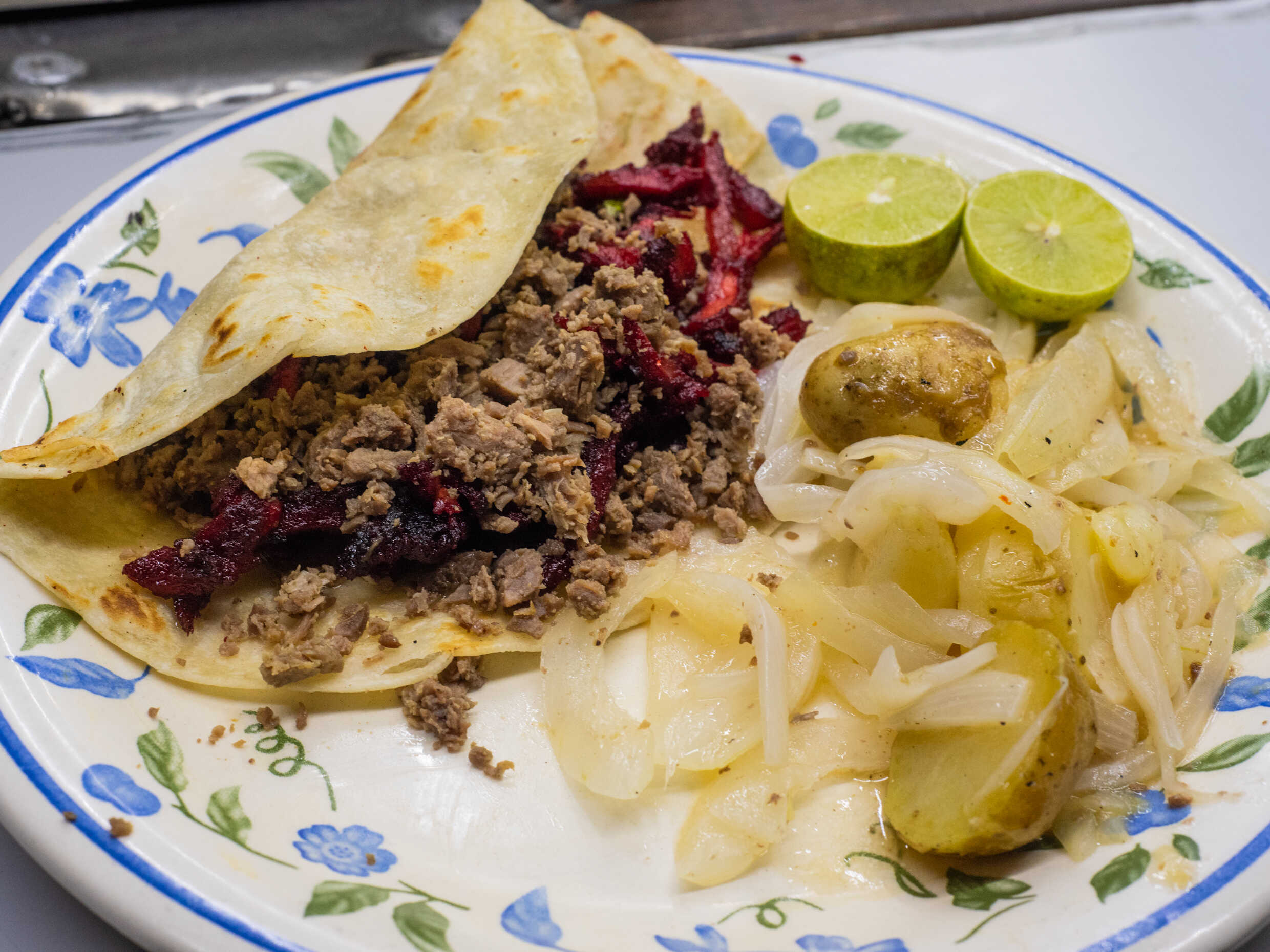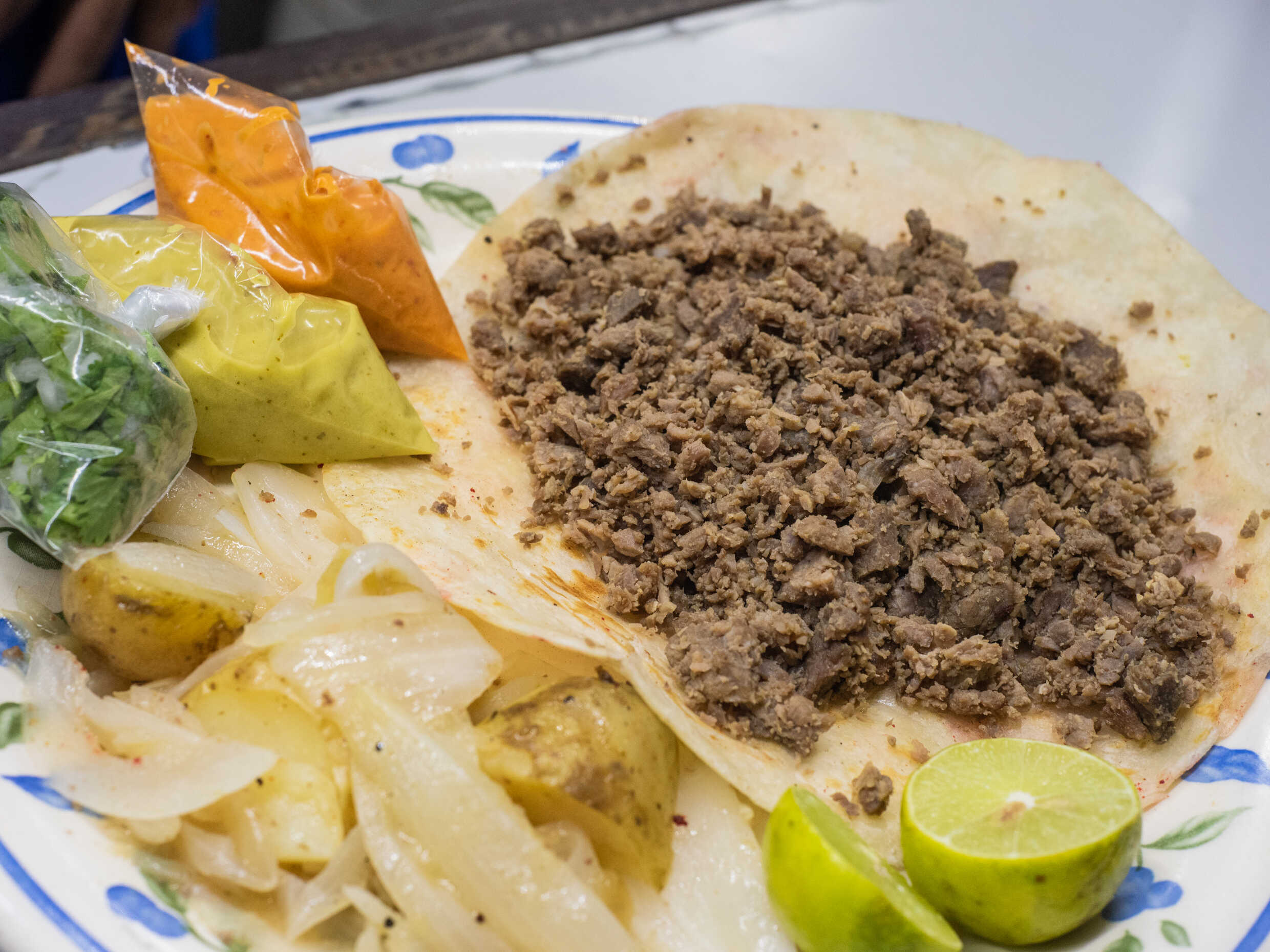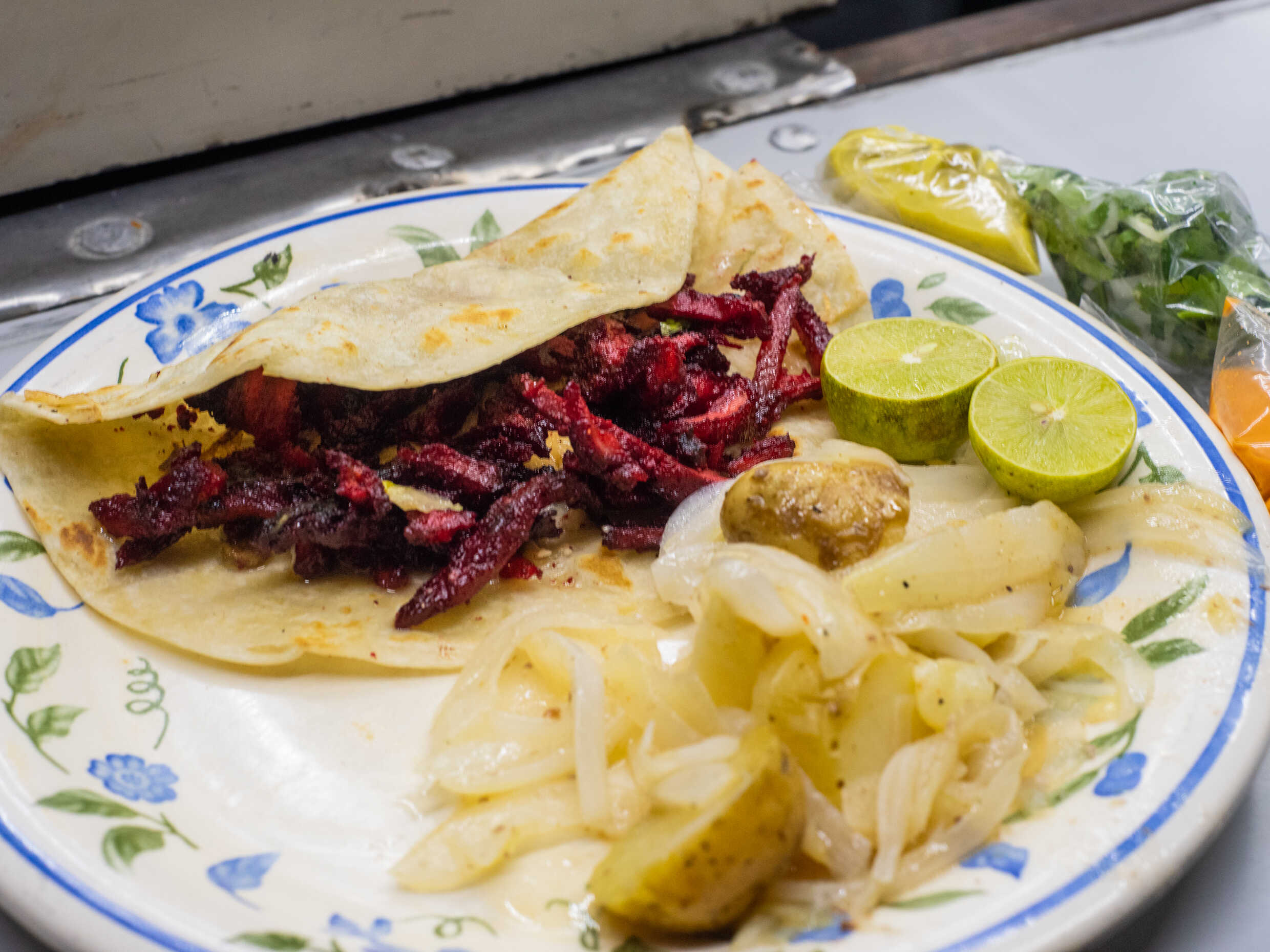 Taco de tortilla de harina de 20cm con queso, carne de bistec. Incluye: Papá galeana con cebolla guisada, cilantro y cebolla, salsa verde, salsa roja y limón.