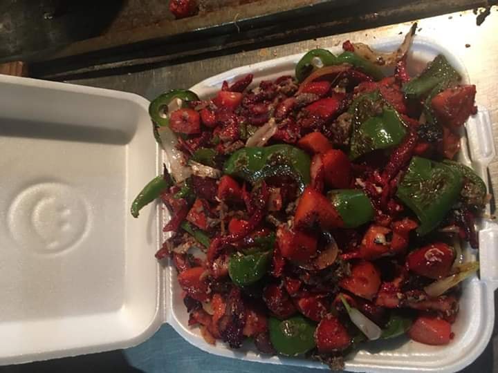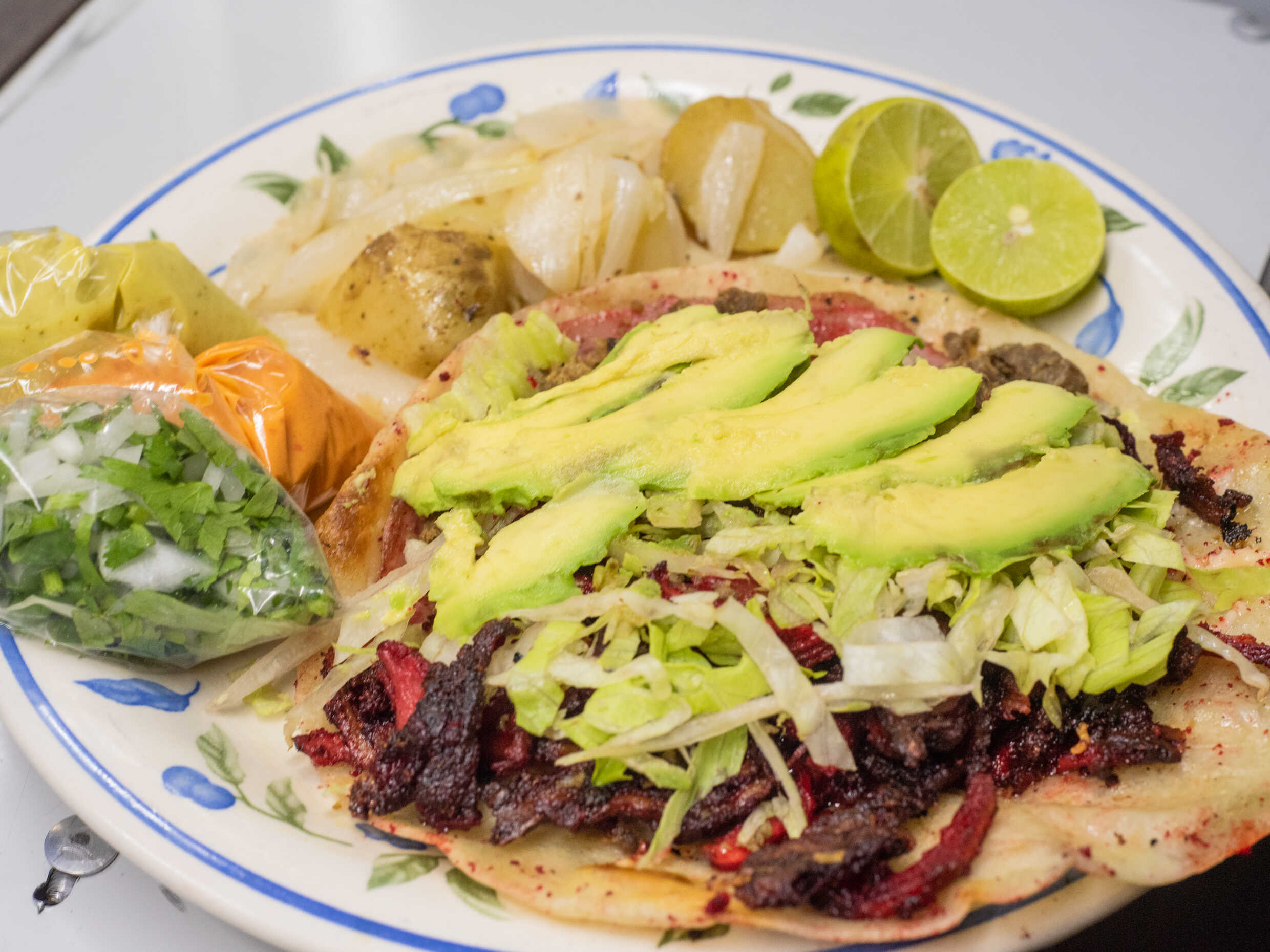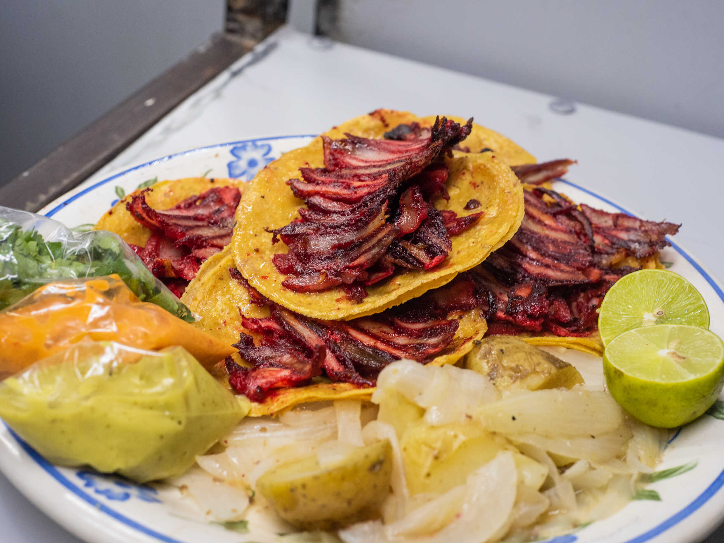 Ingredientes: Carne de bistec y trompo, queso asadero, chile morrón, salchicha, cebolla, tortillas, salsa, cebolla y cilantro.