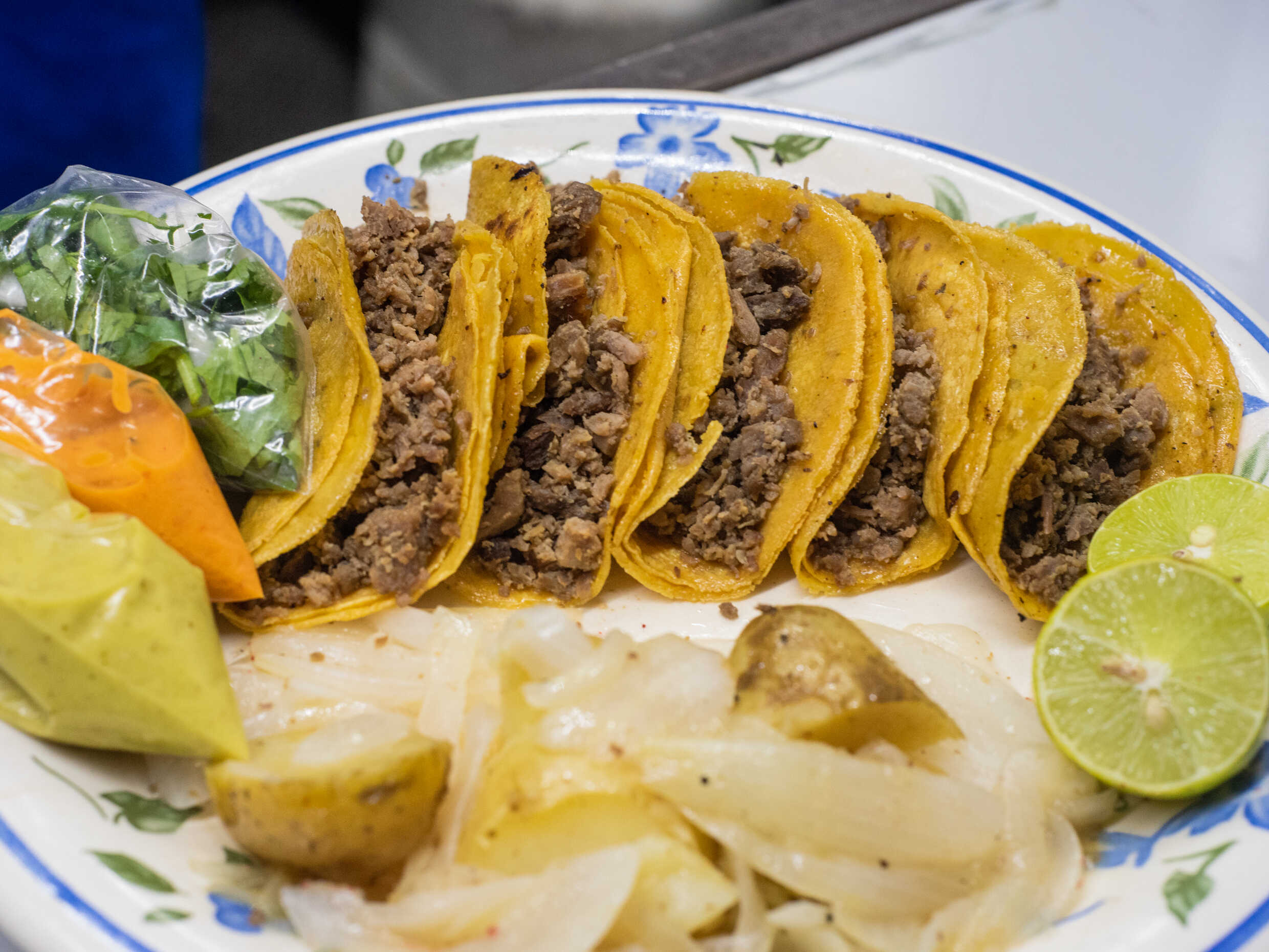 Orden con 5 tacos de carne de bistec. Incluye: Papá galeana con cebolla guisada, cilantro y cebolla, salsa verde, salsa roja y limón.