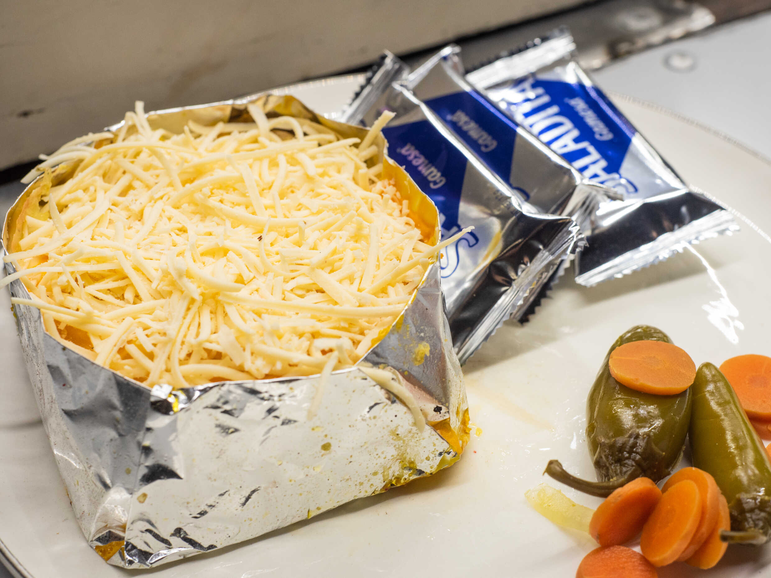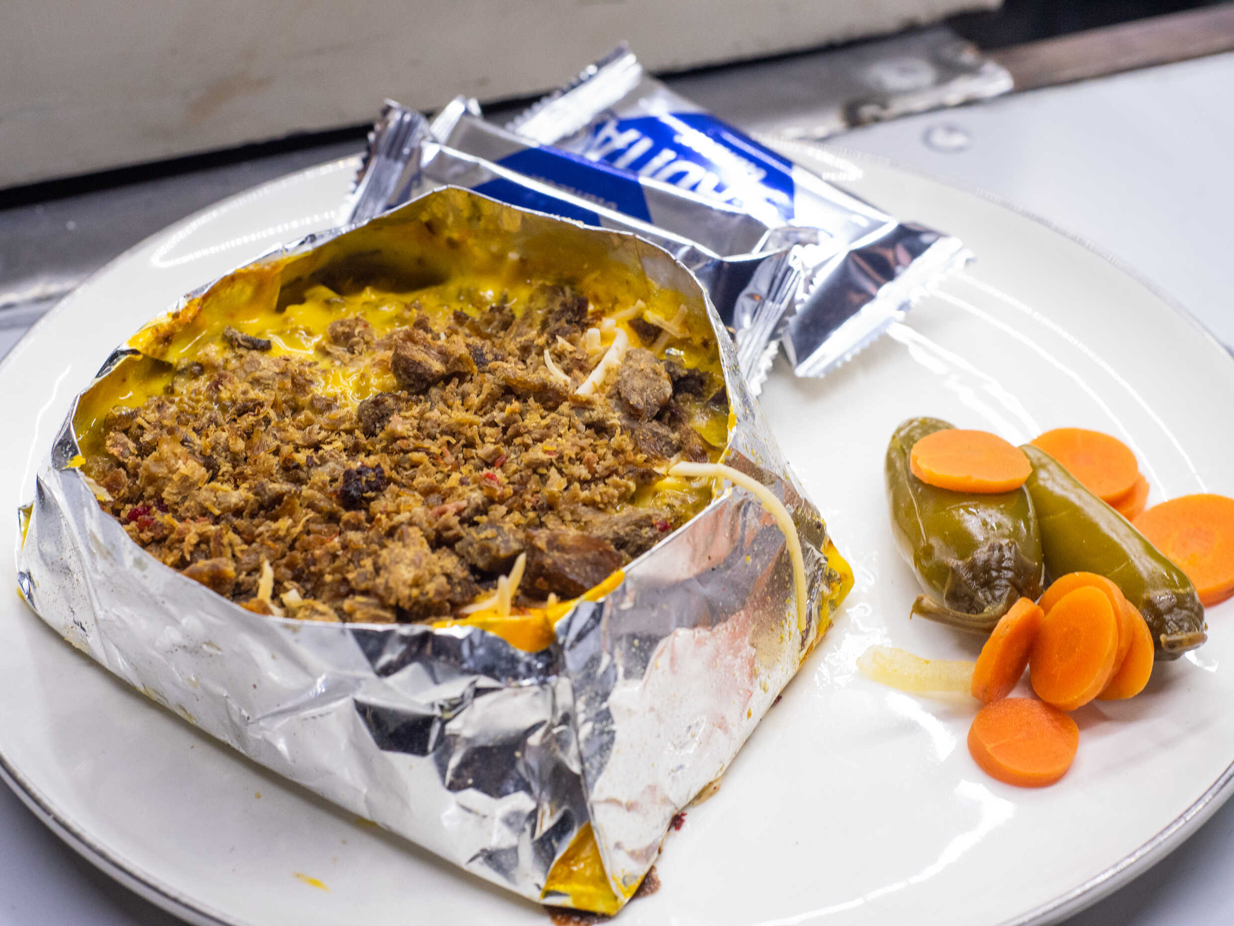 Ingredientes: Papa con queso, crema, mantequilla y carne de bistec. Incluye: Galletas saladas y chile jalapeño.