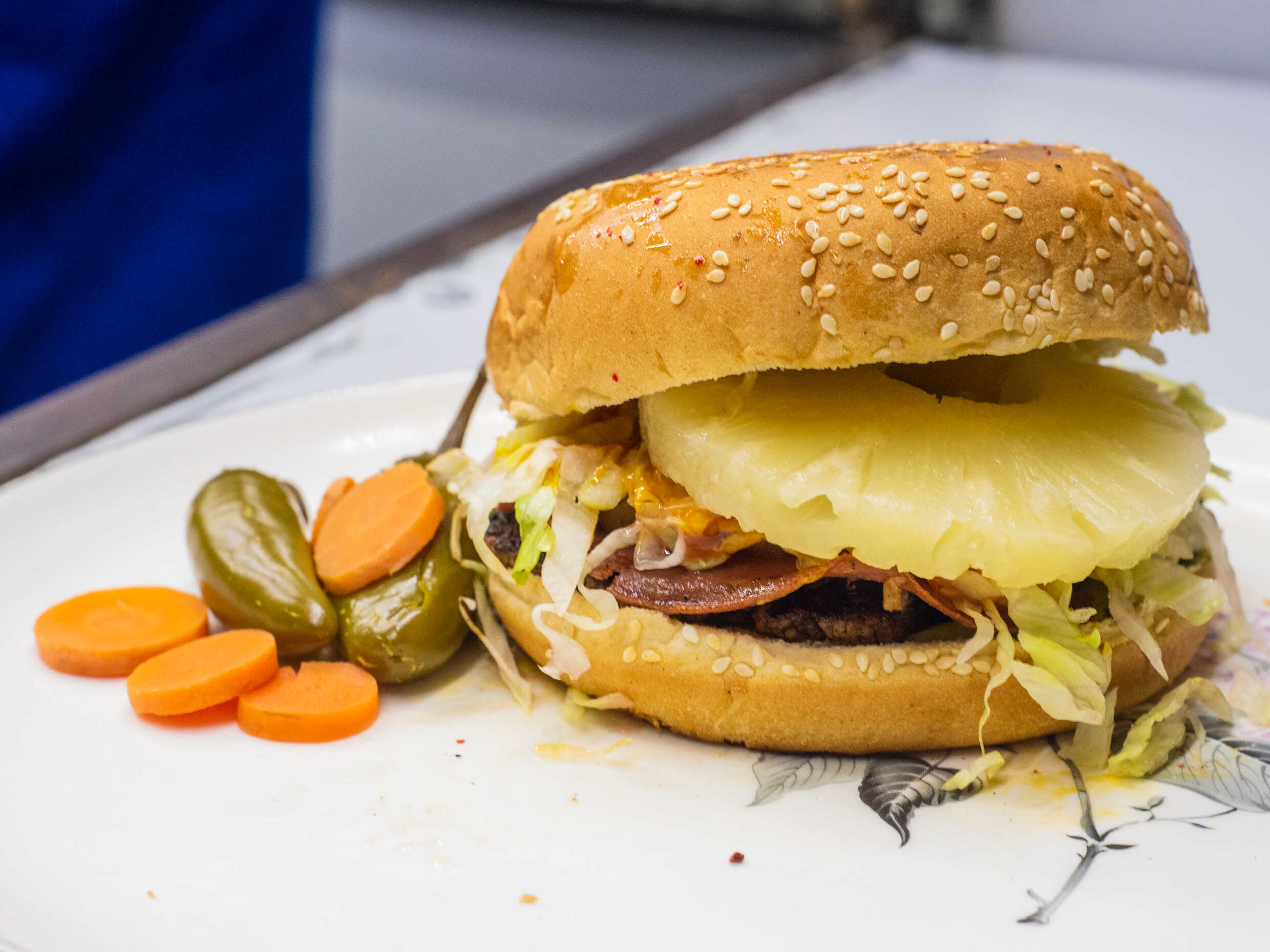 Ingredientes: Carne casera, piña dorada, aguacate, jamón, queso asadero, mayonesa, cátsup, chiles jalapeños.